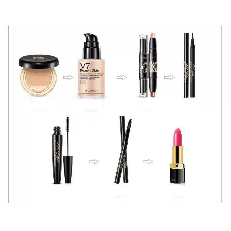 BỘ TRANG DIDEERNM V7 ĐẦY ĐỦXuất xứ: Đài Loan Gồm 7 Sản Phẩm: + Chì kẻ chân mày đầu chì dạng ngang định dạng chân mày, cọ bột giúp tán đều cho nét mày đầy đặn, tự nhiên, mềm mại. + Bút kẻ mắt BIOAQUA cải tiến với đầu cọ sắc nét chỉ 0.01mm, cực kì linh hoạt giúp bạn dễ dàng vẽ mắt từ nét mỏng tự nhiên đến dày cá tính. Công nghệ màng phim độc đáo không lem, không trôi suốt 17 giờ lại hoàn toàn dễ tẩy trang. + Mascara BIOAQUA đầu cọ mới vuốt mi cong vút 100º, chải từng sợi cho mi tơi, dày đều. Dạng gel đặc biệt, nhẹ, mượt giữ mi cong suốt 18h, mi dày gấp 3 lần, không vón cục, không lem, không trôi. + Tạo khói bắt sáng dạng thỏi giúp gương mặt được nhấn sáng trở nên thon gọn, căng mướt sắc sảo nhưng vẫn tự nhiên. + Phấn nước nền với khả năng che phủ hoàn hảo giúp che phủ tốt các khuyết điểm trên da. Duy trì lớp trang điểm trong thời gian dài mà không xảy ra hiện tượng xuống tông khiến khuôn mặt bị tối. Phấn tạo cảm giác da mướt, mượt mà không bị mốc hay khô da. Độ kiềm dầu tốt, phù hợp với cả bạn da dầu hay hỗn hợp dầu đến da thường. Kết cấu kem mềm mỏng mịn giúp tăng khả năng bám trên da và không bị bết dính. + Son không khô môi, son cũng không hề bị len vào các rãnh môi khiến cho bạn cảm thấy môi mình đầy khuyết điểm, mà ngược lại, cái cảm giác để lại trên môi bạn là môi mềm, mịn, matte, cùng với màu sắc tinh tế khiến ai nhìn vào cũng bị đắm chìm sự quyến rũ. + Kem lót mịn da với kết cấu gel mịn dễ tán tạo hiệu ứng thu nhỏ lỗ chân lông, ngăn bóng nhờn nhưng vẫn cung cấp đủ độ ẩm cho da và chiết xuất cherry chống lão hóa da.