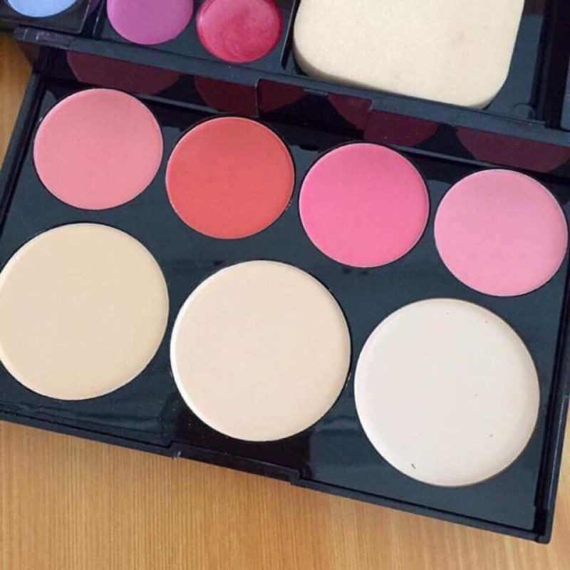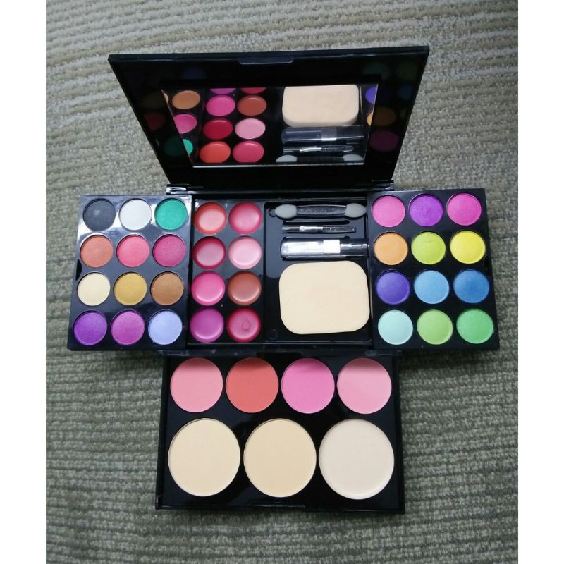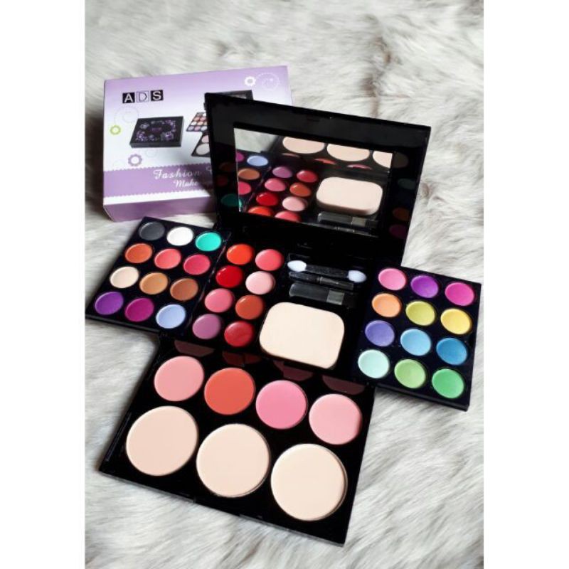 Bộ trang điểm ADS Bộ sản phẩm bao gồm: Màu mắt, má hồng, màu son môi, màu phấn phủ kèm cọ, bông phấn và gương trang điểm.