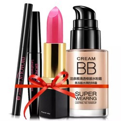 Bộ trang điểm gồm 4 món cơ bản : + Chì kẻ chân mày đầu chì dạng ngang định dạng chân mày, cọ bột giúp tán đều cho nét mày đầy đặn, tự nhiên, mềm mại. + Mascara đầu cọ mới vuốt mi cong vút 100º, chải từng sợi cho mi tơi, dày đều. Dạng gel đặc biệt, nhẹ, mượt giữ mi cong suốt 18h, mi dày gấp 3 lần, không vón cục, không lem, không trôi. + Son không khô môi, son cũng không hề bị len vào các rãnh môi khiến cho bạn cảm thấy môi mình đầy khuyết điểm, mà ngược lại, cái cảm giác để lại trên môi bạn là môi mềm, mịn, matte, cùng với màu sắc tinh tế khiến ai nhìn vào cũng bị đắm chìm sự quyến rũ . + Kem lót mịn da với kết cấu gel mịn dễ tán tạo hiệu ứng thu nhỏ lỗ chân lông, ngăn bóng nhờn nhưng vẫn cung cấp đủ độ ẩm cho da và chiết xuất cherry chống lão hóa da