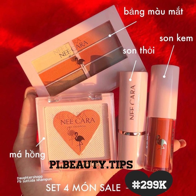 HOT SALE SET NEE CARA 4 MÓN gồm : 🔸Bảng màu mắt siêu xinh tone cam đào 🔸Má hồng tone cam đào 🔸1 thỏi son kem lip gloss ( được chọn màu đỏ hoặc cam ) 🔸1 thỏi son sáp tone cam ✖️GIÁ SALE 450K ---> #299k / set thôi àhhhh ✖️SỐ LƯỢNG CÓ HẠN THÔI Ạ ➖➖➖➖➖➖➖➖➖➖➖ 🌈Shopee/Fanpage/Instagram : Pi.Beauty.Tips Các bạn có shopee cứ vào shopee bé đặt hàng nhé