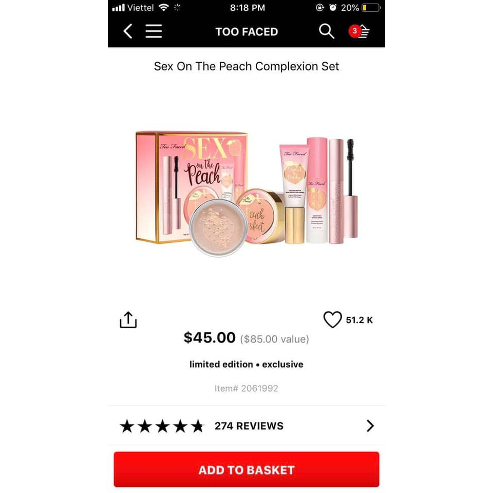 Mọi ng đặt ngay đi e ko đùa đâu. Set này HOT cực luôn Sephora OFF 20% kiểu j cũng sold :(( ❌Set Too Faced Peach thần thánh ‼️‼️‼️ Bình thường hộp phấn phủ đào ko đã 7️⃣xx rồi mà nay nguyên set 4 món có 1️⃣xxx/set (x siêu nhỏ) thì tội gì ko cơ chứ 😱😱😱 Set Too Faced Sex On The Peach gồm 4 món siêu hời : 🍑 Phấn phủ bột không màu Too Faced Peach Perfect FULL-SIZE 3️⃣5️⃣g : bé phủ bột với hương đào gây nghiện, được biết đến với khả năng #kiềm #dầu, #che lỗ chân lông với hiệu ứng cà mặt cực #láng #mịn 🍑 Mascara Too Faced Better Than Sex FULL-SIZE 8️⃣g : Cây mascara thần thánh được hãng ví còn tốt hơn cả sex 😂 🍑 Kem lót kiềm dầu Too Faced Cooling Matte Skin Perfecting travel-size 2️⃣0️⃣ml : kem lót #kiềm #dầu cực đỉnh sử dụng công nghệ #Cooling làm mát giúp da mượt mà mát lạnh, dễ chịu và #căng #mọng hơn như sau khi đắp mặt nạ. Chất kem có màu hồng phấn ánh nhũ nhẹ giúp da lấy lại vẻ tưoi sáng rạng rỡ 🍑 Xịt khoáng kiềm dầu + khoá nền Too Faced Peach Mist Mattifying travel-size 3️⃣0️⃣ml: khi kết hợp với các sản phẩm trong bst Peach Perfect sẽ trở thành “cặp bài trùng” cực khủng, thực hiện hoá “giấc mơ” có lớp nền lâu trôi vẹn nguyên cả ngày của những cô nàng da dầu. Cả set nếu riêng từng món phải 85$ nhưng theo set thì chỉ còn 45$