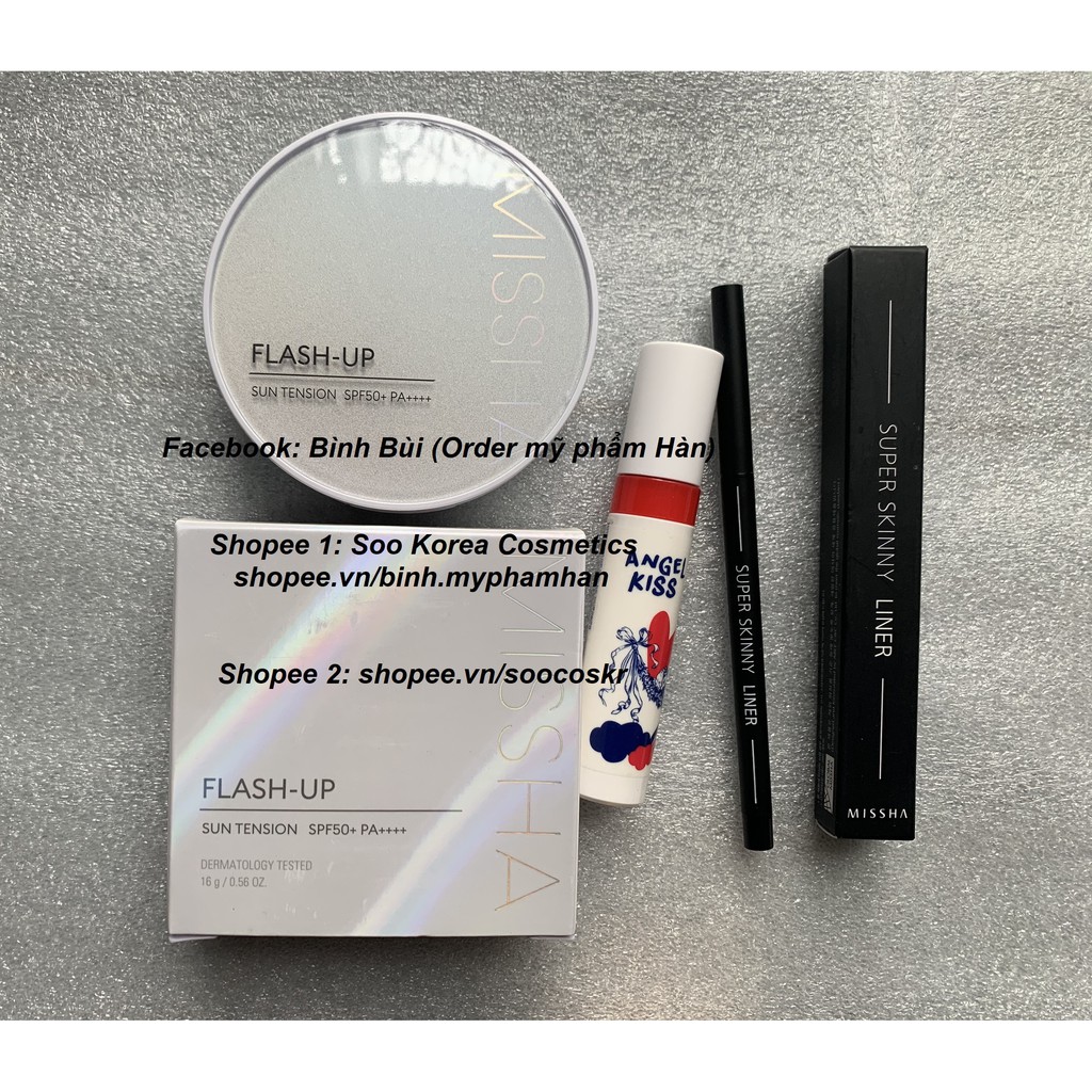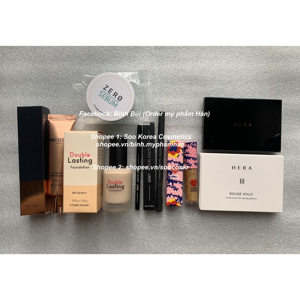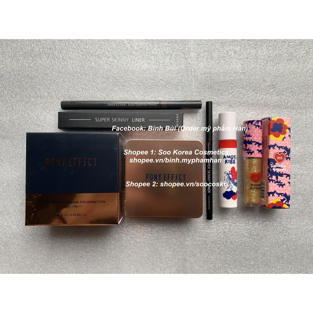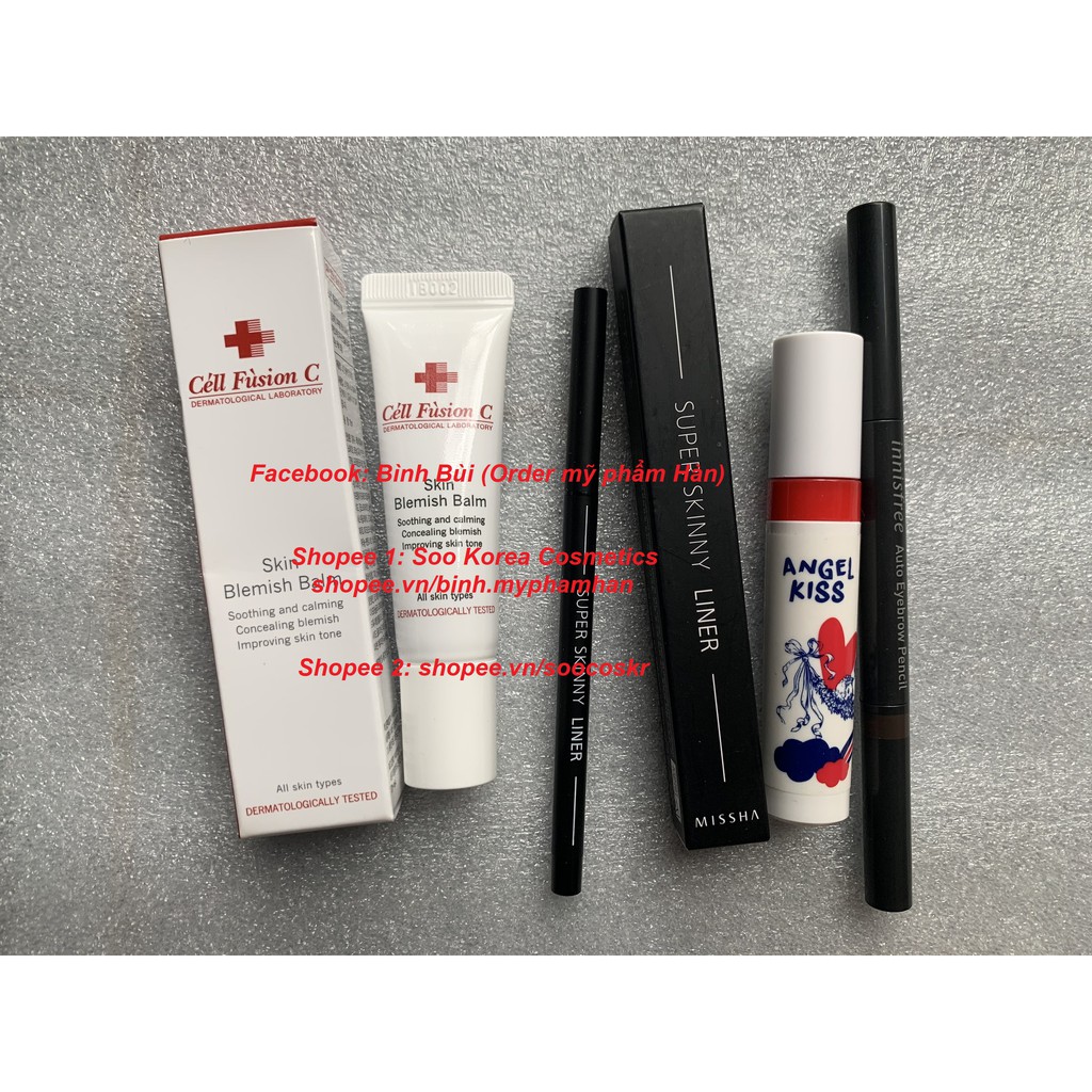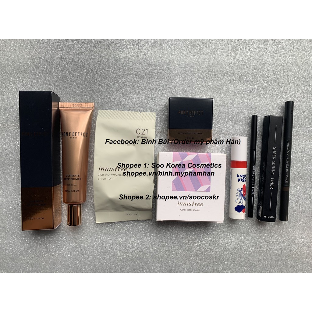 Đặt hàng ở link: shopee.vn/soocoskr để có giá tốt [AUTH] Bộ makeup có đủ son, kem lót, kem nền, phấn phủ, highlight, má hồng, phấn mắt, kẻ mắt, nhũ mắt, chì mày, cọ,... Chỉ từ 300k Chị em ib để chọn tone kem và màu chì, màu son ạ Bộ 1 gồm: - 1 Kem nền Cell Fusion C Skin Blemish Balm 10ml (fullsize 50ml tầm 800k-1.100k) - 1 Kẻ mắt siêu mảnh, chống thấm nước Missha Super Skinny Liner 1.5mm - 1 Son tint lâu trôi Aritaum Angel Kiss Tint (ib chọn màu) - 1 Chì mày 2 đầu Innisfree Auto Eyebrow Pencil (ib chọn màu) Bộ 2 gồm: - 1 Phấn nước tension nâng tone, chống nắng Missha Flash-up Sun Ten sion SPF 50+/PA++++ - 1 Kẻ mắt siêu mảnh, chống thấm nước Missha Super Skinny Liner 1.5mm - 1 Son tint lâu trôi Aritaum Angel Kiss Tint (ib chọn màu) - 1 Chì mày 2 đầu Innisfree Auto Eyebrow Pencil (ib chọn màu, trên hình S chụp thiếu chì mày này ạ) Bộ 3 gồm - 1 Cushion Pony Effect Coverstay Cushion Foundation - 1 Nhũ mắt 3CE Maison Kitsune - 1 Kẻ mắt siêu mảnh, chống thấm nước Missha Super Skinny Liner 1.5mm - 1 Son tint lâu trôi Aritaum Angel Kiss Tint (ib chọn màu) - 1 Chì mày 2 đầu Innisfree Auto Eyebrow Pencil (ib chọn màu) Bộ 4 gồm - 1 Lõi cushion Innisfree coverfit hoặc waterfit (ib chọn màu) - 1 Case cushion Innisfree (Ib chọn case) - 1 Kem lót siêu mỏng mịn, kiềm dầu che lỗ chân lông Pony Effect Ultimate Prep Primer - 1 Che khuyết điểm Pony Effect Cover up Pro Concealer tone 13 - 1 Kẻ mắt siêu mảnh, chống thấm nước Missha Super Skinny Liner 1.5mm - 1 Son tint lâu trôi Aritaum Angel Kiss Tint (ib chọn màu) - 1 Chì mày 2 đầu Innisfree Auto Eyebrow Pencil (ib chọn màu) Bộ 5 gồm: - 1 Kem lót siêu mỏng mịn, kiềm dầu che lỗ chân lông Pony Effect Ultimate Prep Primer - 1 Kem nền kiềm dầu lâu trôi Etude House Double Lasting Foundation (ib chọn tone) - 1 Phấn phủ bột kiềm dầu Etude House Zero Sebum - 1 Nhũ mắt 3CE Maison Kitsune - 1 Bảng son cao cấp 10 màu Hera Rouge Holic Vivid Coulors for lasting glamour (kèm cọ) - 1 Kẻ mắt siêu mảnh, chống thấm nước Missha Super Skinny Liner 1.5mm - 1 Chì mày 2 đầu Innisfree Auto Eyebrow Pencil (ib chọn màu) Bộ 6 gồm: - 1 Kem lót siêu mỏng mịn, kiềm dầu che lỗ chân lông Pony Effect Ultimate Prep Primer 35g - 1 Kem nền mỏng mịn, che phủ tốt, kiềm dầu Pony Effect Coverstay Liquid Foundation 30g - 1 Phấn phủ bột kiềm dầu Etude House Zero Sebum - 1 Bảng son, phấn mắt, highlighter,... Pony Effect Galaxy Holographic Palette (có kèm cọ mix, đánh son) - 1 Kẻ mắt siêu mảnh, chống thấm nước Missha Super Skinny Liner 1.5mm - 1 Chì mày 2 đầu Innisfree Auto Eyebrow Pencil (ib chọn màu)
