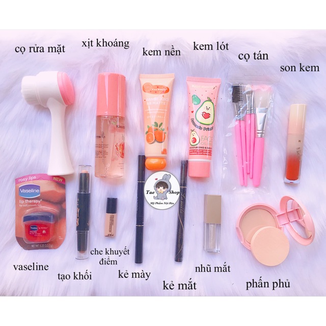 COMBO MAKEUP 13 MÓN CẦN THIẾT 💕 -Cọ rửa mặt -Xịt khoáng -kem nền -Kem lót -Bộ cọ -Son kem -Vaseline -Tạo khối -Che khuyết điểm -Kẻ mắt -Kẻ mày -Nhũ mắt -Phấn phủ