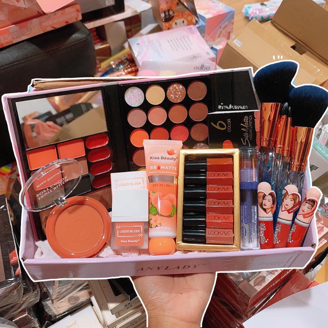 #460k/set make up 20 món : - 1 bảng phấn mắt + má hồng + son + highlight +tạo khối đủ cả - 6 cây son look me - 1 phấn má hồng dạng kem kiss beauty - 1 kem nền bb matte kiss beauty - 1 mascara trong suốt - 3 cây son kiss me kiss beauty - 7 cây cọ siêu cute sỉ tự nâng giá bán. Order Thái lan hotline 0376450421 & 0376450421