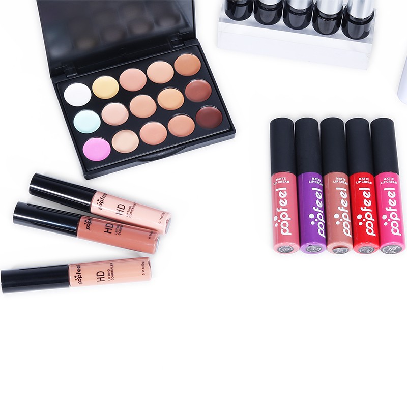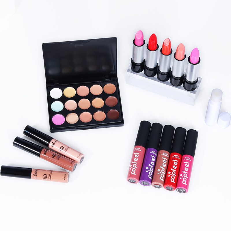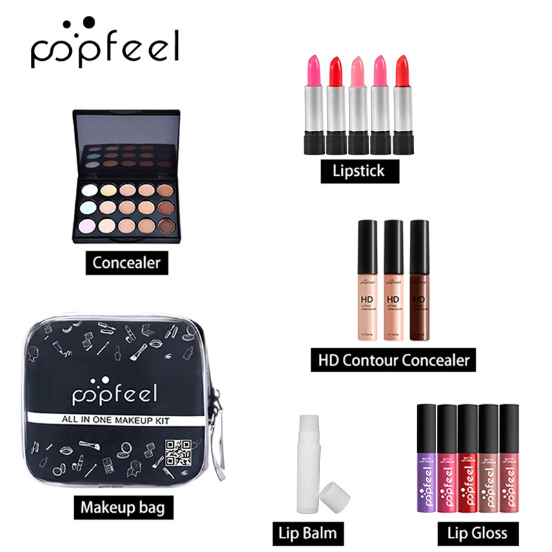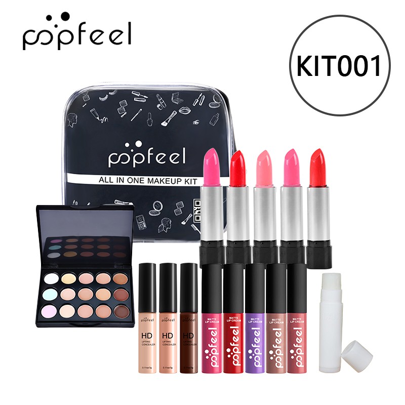 Package Included: Lip gloss x4 Lipstick x5 Concealer x3 Lip balm x1 Concealer palettex 1 Cosmetic bag x1 Specifications: KIT001 contains the following products: Description: Brand Name: popfeel Origin: CN(Origin) NET WT: 100g Type: Makeup Set Quantity: 1 SET Model Number: KIT001