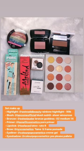 Mình xin giới thiệu 1 set makeup mình toàn những sản phẩm mình thích - Highlight wnw rainbow -99k - Má hồng Lancome mini - 159k - Bronzer Estee lauder mini - 159k - Kem lót benefit pore primer fullsize -550k - Son too faced màu rated R - 195k - Kẻ mày nyx dạng gel màu espreso - 159k - Kẻ mắt nước gel colourpop -159k - Bảng phấn mắt Yes please colourpop - 440k