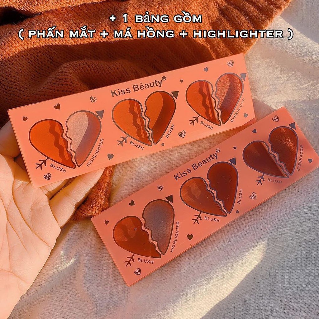 4 cây cọ kèm box đựng 1 bảng phấn ( phấn mắt + phấn má + high lighter ) 1 kem nền kissbeauty 1 son kem lì , lên màu chuẩn , không gây khô môi 1 phấn phủ kiềm dầu tặng kèm bông phấn Shop bán hàng thái lan Bao hàng chuẩn Thái ạ Shop COD toàn quốc