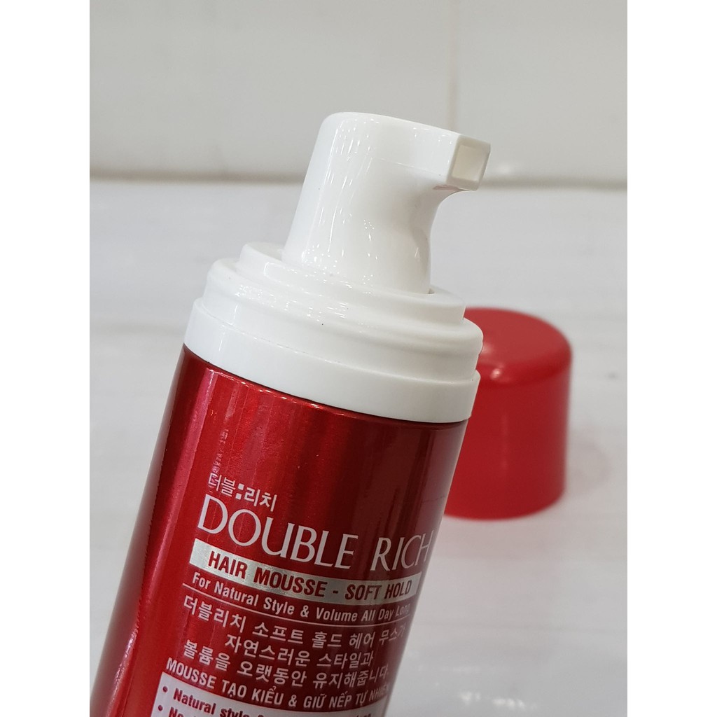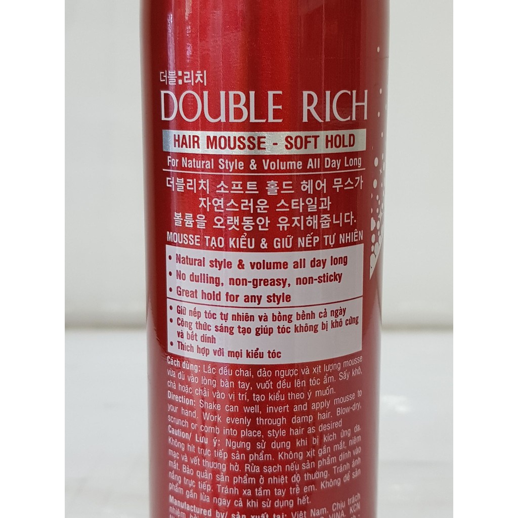 - Mousse xịt tóc Double Rich Hair với thành phần giàu dưỡng chất vừa dưỡng tóc vừa mang lại hiệu quả sử dụng lâu dài, nếp tóc được cố định, không bị rối bù, bảo đảm độ sống động tự nhiên, cho bạn mái tóc dày hơn, không bị tổn hại bởi ánh nắng mặt trời . - Mousse xịt tóc Double Rich Hair có kết cấu dạng bọt nhẹ, giúp các lọn tóc xoăn vào nếp, làm mềm và giảm rối cho tóc. Công thức tăng cường gấp đôi dưỡng chất không chỉ giúp giữ nếp bồng bềnh ngay lúc tạo kiểu mà còn có tác dụng nuôi dưỡng tận sâu bên trong từng sợi tóc, cho mái tóc chắc khỏe dài lâu. Mousse xịt tóc Double Rich Hair được sản xuất theo công nghệ hiện đại của Hàn Quốc. Cách sử dụng: Lắc đều chai, đảo ngược và xịt lượng mousse vừa đủ vào lòng bàn tay, vuốt đều lên tóc ẩm. Sấy khô, chà hoặc chải vào vị trí, tạo kiểu theo ý muốn.