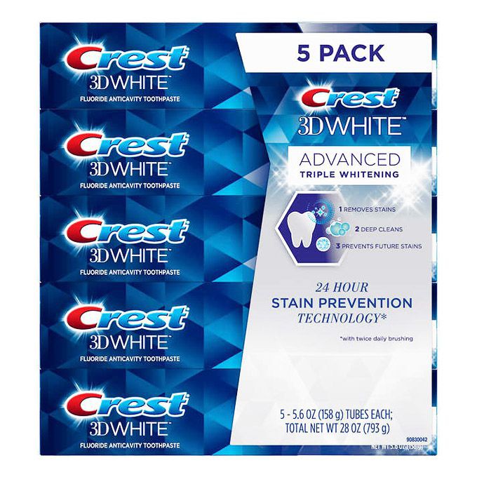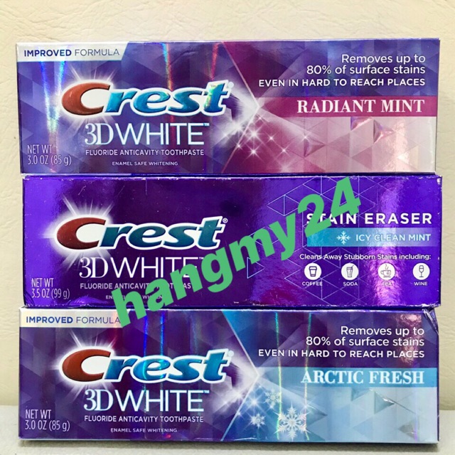 - Kem Đánh Răng - Crest 3D White Advanced có tác dụng làm sạch răng, phòng ngừa sâu răng, giảm viêm nướu, giảm sự hình thành vôi răng, giảm nhạy cảm răng, giữ cho hơi thở thơm mát giúp bạn tự tin hơn mỗi khi giao tiếp. - Crest 3D White Advanced với công thức mới làm trắng răng cực nhanh. Nó không chỉ làm sạch răng, vết bẩn trên bề mặt mà còn nhẹ nhàng đánh bóng, bảo vệ răng giúp ngăn chặn những tác hại về răng và nướu, giảm sự hình thành vôi răng, giảm nhạy cảm răng, giữ cho hơi thở thơm mát - Kem Đánh Răng - Crest 3D White Advanced có tác dụng làm sạch răng, phòng ngừa sâu răng, giảm viêm nướu, giảm sự hình thành vôi răng, giảm nhạy cảm răng, giữ cho hơi thở thơm mát. Bên cạnh đó, kem đánh răng Crest còn là kem đánh răng đầu tiên được Hiệp hội Nha khoa Hoa Kỳ (American Dental Association-ADA) chứng nhận và cũng là hãng đầu tiên được phép sử dụng tên tuổi ADA trong các quảng cáo của mình. - Crest 3D Glamorous White Fluoride Anticavity với công thức mới làm trắng răng cực nhanh, không chỉ làm sạch răng, vết bẩn trên bề mặt mà còn nhẹ nhàng đánh bóng, bảo vệ răng giúp ngăn ngừa tác hại về răng nướu, giảm nhạy cảm răng,... đem đến hàm răng trắng, chắc khỏe cho bạn. - Kem Đánh Răng - Crest 3D White Advanced đóng chai đẹp mắt, không chứa hóa chất độc hại, an toàn cho sức khỏe người dùng