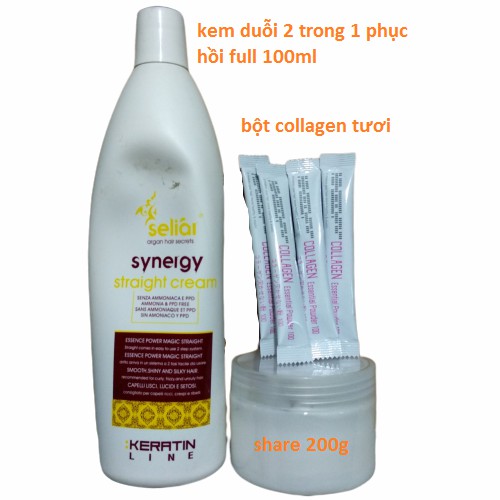 LƯU Ý ĐẶT HÀNG 1. share 200g (CHỈ CÓ 200G KEM DUỖI) 2.share 200g+bột clgt (200 KEM DUỖI VÀ 1 GÓI BỘT COLLGEN) 3. 4 bột collagen tươi ( 4 GÓI COLLAGEN KHI KHÁC MUỐN LẤY THÊM ĐỂ VỀ Ủ DƯƠNG SAU DUỖI) KEM DUỖI TÓC PHỤC HỒI 3 TRONG 1 Seliar 1000ml chai full share lẻ cho khách LƯU Ý DO TRẠNG THÁI SẢN PHẨM SẼ ĐƯỢC CHIẾT SANG LOẠI HŨ Ủ DỪA THÁI ĐỂ ĐẢM BẢO VẬN CHUYỂN VÀ CHẤT LƯỢNG SẢN PHẨM CÁC BẠN MUA HÀNG CẦN ĐỌC KÝ THÔNG TIN NÀY KHI ĐÃ ĐẶT HÀNG LÀ ĐỒNG Ý VỚI LƯU Ý CỦA SHOP Dạng chiết share dành cho các bạn dùng ít hoặc tóc mái 200g đc 1 đầu tóc dài dày shop có bán kem theo bột collagen tươi giúp tăng dinh dưỡng cho tóc căng bóng Chỉ cần 1 sản phẩm duỗi và dập định hình tóc thay cho 2 sản phẩm như các thuốc duỗi thông thường khác ... vừa tiết kiệm thời gian và tiền bạc của bạn HDSD: *Quy trình duỗi tóc hư hại từ gốc đến ngọn: Bước 1: Gội đầu bằng dầu gội (dùng nước ấm) k dùng dầu xả Bước 2: Sấy khô tóc. Bước 3: Bôi kem duỗi + ủ phục hồi hoặc bột collagen keratin tươi (nếu tóc quá yếu nát) cách chân tóc 1cm đến ngọn tóc (chú ý bôi kem vừa đủ) [bột collagen tươi pha 1 gói với 20ml nước ấm rồi trộn vào kem duỗi]80 Bước 4: Dùng bao ni-lon trùm kín lại nếu ở nhiệt độ thời tiết lạnh Bước 5 từ 10- 35p kiểm tra độ dãn nở của tóc tùy tóc khỏe hay yếu thấy dãn nở tóc thì xả sạch sấy khô Bước 6: Dùng cây chải sấy tóc từ chân tóc đến ngọn tóc. Bước 7: Kẹp thẳng tóc từ chân tóc đến ngọn tóc, mỗi lớp tóc kẹp từ 3 - 4 lần (tóc khỏe nhiệt độ 180, tóc nhuộm nhiệt độ 160, tóc highlight nhiệt độ 150).(có thể dùng máy sấy dùng lược kéo thẳng và sấy mượt ra) Bước 9: sau khi là xong có thể dùng tinh dầu dưỡng lấy tinh dầu da tay 1-2 giọt xoa đều rồi vuốt đan xen lên tóc => Tóc thẳng, bóng, mượt ưu điểm sản phẩm không để lại mùi sau khi dùng trên tóc