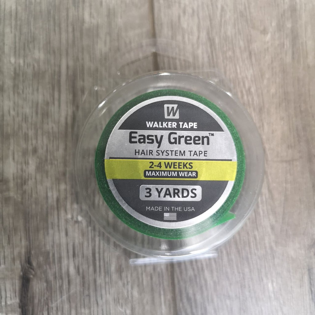 Cuộn băng dính dán tóc giả Easy Green là sản phẩm mới của hãng Walker Tape với chất lượng dính khá tốt. Băng dính Easy Green rất dễ sử dụng và có thời gian dính khoảng hơn 2 tuần, vệ sinh tháo băng keo sau khi dùng rất dễ dàng và nó không làm ảnh hưởng hay làm hỏng các mối móc tóc trên nền lưới ren, đây cũng là băng dính có độ mỏng nhất hãng Walker Tape sản xuất mà không gây dị ứng da. Sản phẩm gần giống với sản phẩm cuộn băng dính Lace Front (băng dính xanh nước biển), nhưng có 1 lớp làm cứng, chính lớp làm cứng này làm cho việc tháo bỏ băng keo sau khi sử dụng sẽ dễ dàng hơn. Băng dính dán tóc easy Green cuộn 1,9 cm (3/4 inch); dài 3 yard ( 270 cm)