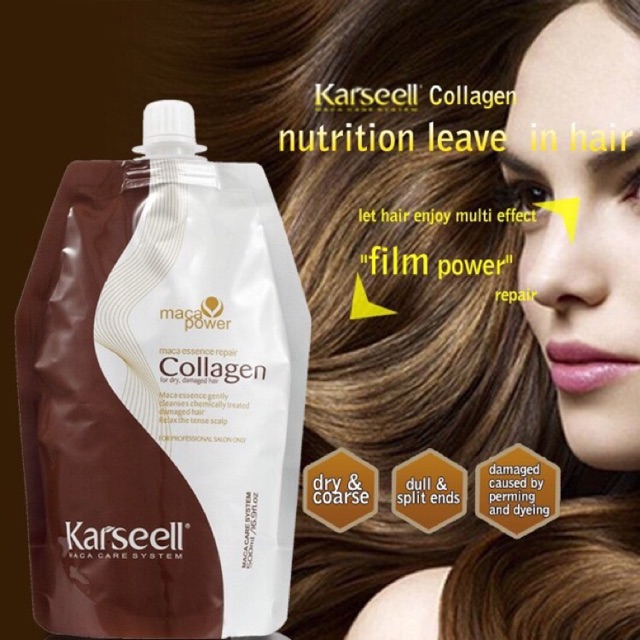 Ủ tóc Collagen Karseell là dòng sản phẩm ủ dưỡng tóc chuyên dụng có công dụng cung cấp dưỡng chất, phục hồi tóc hư tổn nhanh, với thành phần collagen giúp phục hồi độ ẩm và độ bóng mượt cho bạn mái tóc mềm, suôn mượt, bóng, óng ả chỉ sau 1 lần sử dụng. Ủ tóc Collagen Karseell dùng được cho cả nam và nữ, đặc biệt thích hợp cho các bạn sở hữu mái tóc khô, dễ gãy rụng, chẻ ngọn hoặc hư tổn do thời tiết hoặc nhuộm quá nhiều lần. Sản phẩm tuyệt đối không gây kích ứng da nên những bạn sở hữu vùng da đầu dễ hói, gãy rụng có thể yên tâm sử dụng. Thành phần của dầu ủ tóc Collagen Karseell gồm nhiều dưỡng chất như hạt macca nguyên chất, collagen tươi, protein, khoáng chất, vitamin E, dầu dừa, dầu bơ, tảo biển và tinh bột lúa mì… có tác dụng giúp nuôi dưỡng tóc từ gốc đến ngọn, phục hồi nhanh và làm chậm quá trình hư tổn của tóc. Collagen tươi cộng thêm protein mang lại công dụng phục hồi tóc hư tổn nặng, tăng liên kết cấu trúc tóc, giúp sợi tóc chắc khỏe, cung cấp độ ẩm giúp tóc hết khô xơ, hơn nữa còn giúp đào thải độc tố có trong tóc và loại bỏ các bã nhờn dư thừa trên tóc. Tóc sau khi sử dụng một lần sẽ mềm mượt, bồng bềnh hơn và thơm hơn. Cách dùng hấp tóc Collagen Karseell Tùy mức độ hư tổn mà bạn lấy một lượng vừa đủ dầu ủ tóc Collagen Karseell pha với nước ấm tỉ lệ 1:1, hòa tan, bôi đều lên tóc, quấn khăn, để tự nhiên hoặc dùng máy kích nhiệt khoảng 20 – 30 phút. Sau đó xả sạch rồi sấy khô tạo kiểu hoặc để tự nhiên. Nên sử dụng kết hợp dầu gội, xả Collagen Karseell để phát huy hiệu quả tối ưu nhất. Xuất xứ: Italia Thương hiệu: Karseell Dung lượng: 500ml Mua le 70k Sĩ 10 bịch trở lên 55k/b