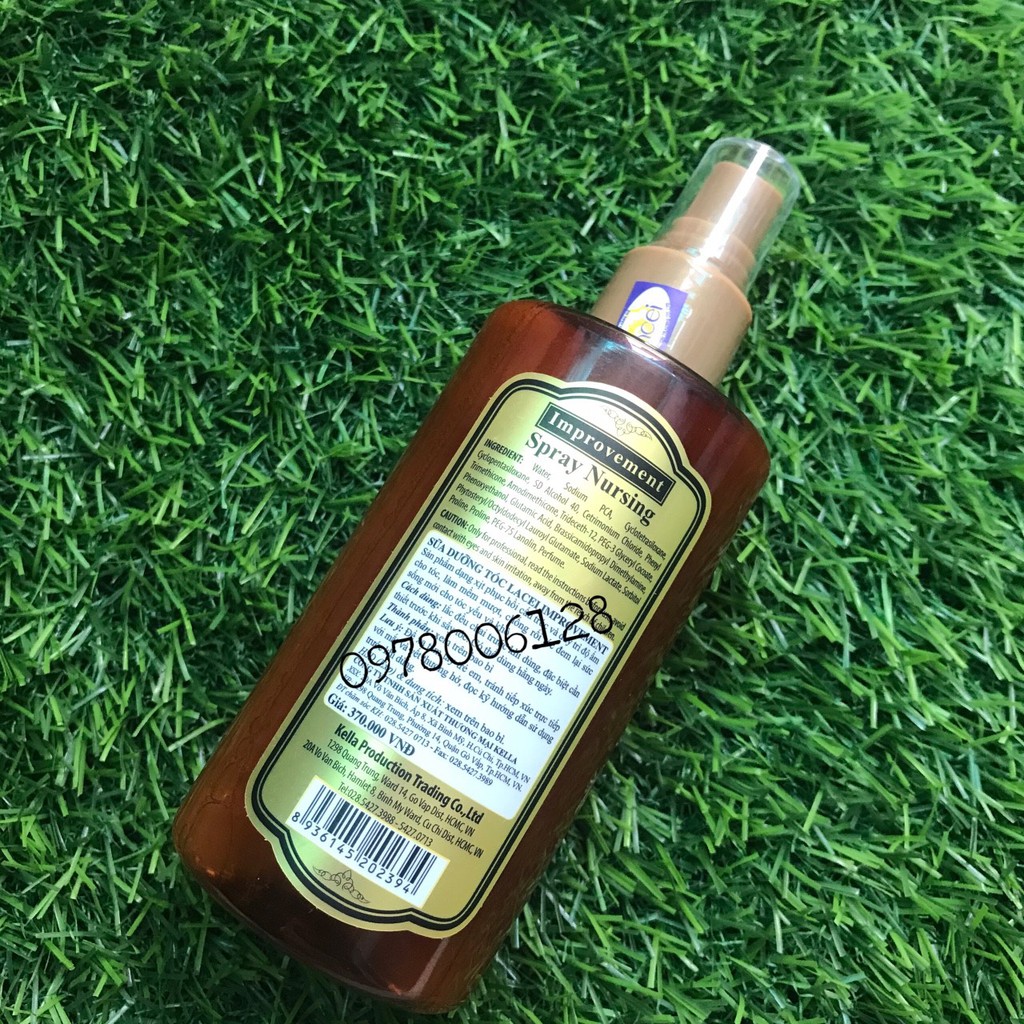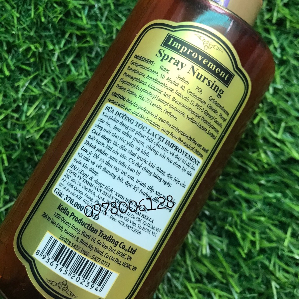 SỮA DƯỠNG TÓC LACEI IMPROVEMENT SPRAY NURSING 250ML - Thành phần: in trên bao bì - Công dụng: Sữa dưỡng tóc Lacei Improvement Spray Nursing được chiết xuất từ những hạt tự nhiên giàu dưỡng chất, có tác dụng phục hồi tóc cũng như cân bằng nhanh độ ẩm nhanh, mang lại sức sống mới cho tóc khô và yếu. Sữa dưỡng tóc Lacei Improvement Spray Nursing được chiết xuất từ những hạt tự nhiên giàu dưỡng chất, có tác dụng cân bằng chỉ trong vòng 30 giây, mang lại sức sống mới cho tóc Giúp phục hồi cấu trúc tóc yếu và khô cũng như duy trì độ ẩm cho tóc, làm mềm mượt tóc, chống rối tóc hiệu quả. - Cách dùng: Sữa dưỡng Lacei Improvement có thể dùng hằng ngày, đặc biệt cần thiết trước khi sấy tóc ( lắc đều chai trước khi dùng để đạt hiệu quả tốt hơn)