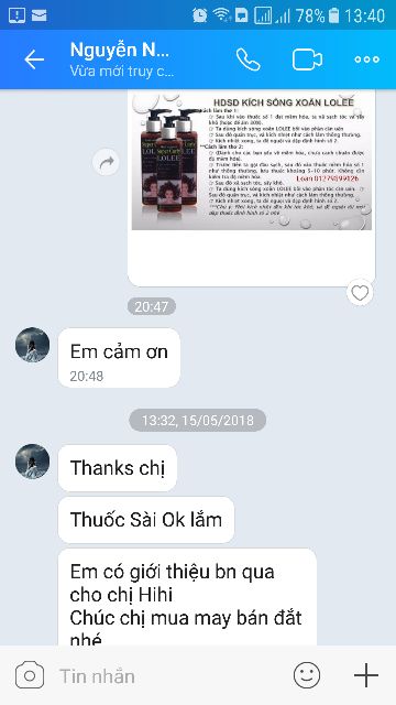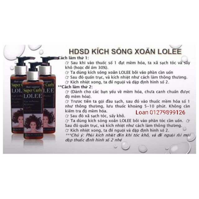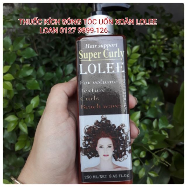 DUNG DỊCH KÍCH XOĂN TÓC UỐN LOLEE SUPER CURLY 250ml Lh : 0819899126 ( Ms Loan ) Dung dịch kích xoăn bổ sung collagen và protein chống cháy và không lo bị khô tóc Đảm bảo tóc xoăn 100% , tóc yếu , tóc tơ mảnh , tóc nhuộm hay tóc bạc đều bật sóng lên hết Không cầu kỳ , chỉ cần mất 50 phút cho một đầu tóc uốn HDSD : **Cách 1: sau khi vào thuốc số 1 đạt mềm hóa , xả sạch tóc và sấy khô 70% Tra thuốc kích xoăn Lolee vào phần cần uốn , quấn trục và kích nhiệt như bình thường Sau khi kích nhiệt ta để nguội và dập định hình tóc số 2 **Cách 2: ( dành cho những bạn yếu về mềm hóa tóc hay chưa canh được độ chuẩn mềm hóa) Trước tiên ta gội sạch tóc , lau khô và vào thuốc số 1 , lưu thuốc 5-10 phút ( không cần kiểm tra độ mềm hóa của tóc ) , xả sạch và sấy khô Ta dùng dung dịch kích sóng Lolee bôi vào phần tóc cần uốn , quấn trục và kích nhiệt như thông thường Kích nhiệt xong ta để nguội và dập định hình thuốc số 2 ***Chú ý : Phải kích nhiệt đến khi tóc khô và để nguội mới dập thuốc định hình số 2 nhé