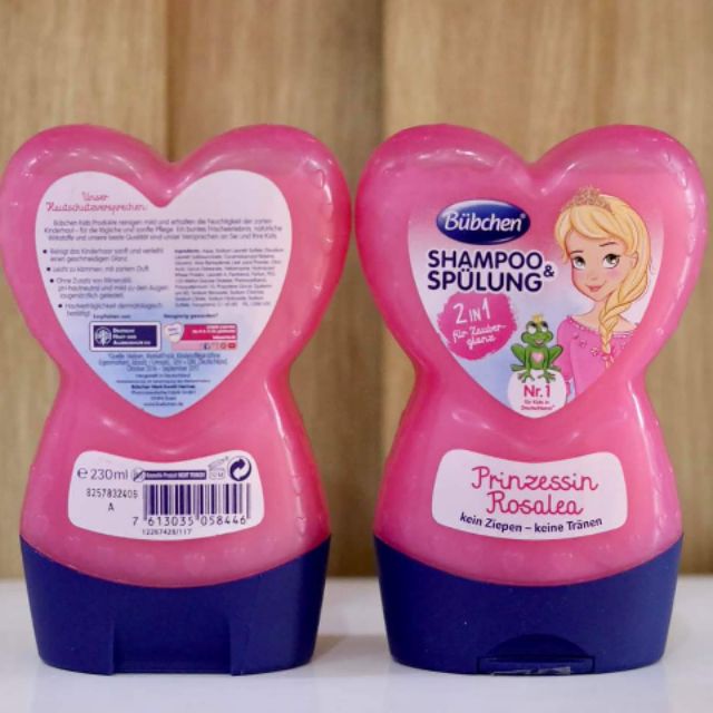 Dầu gội - xả Bübchen (2 in 1) - màu hồng trái tim hình công chúa Rosalea vô cùng xinh xắn đáng yêu, chắc chắn bé nào cũng thích mê ! Xuất xứ : Đức Dung tích : 230ml Giá : 160K -> Hương thơm ngọt ngào quyến rũ đầy mê hoặc -> Giúp nuôi dưỡng và làm sạch tóc của trẻ em -> Với các thành phần tự nhiên giúp mái tóc của bé luôn mềm, mượt mà, óng ả . -> Thân thiện với da đầu, ko làm cay mắt bé -> 100% thuần chay