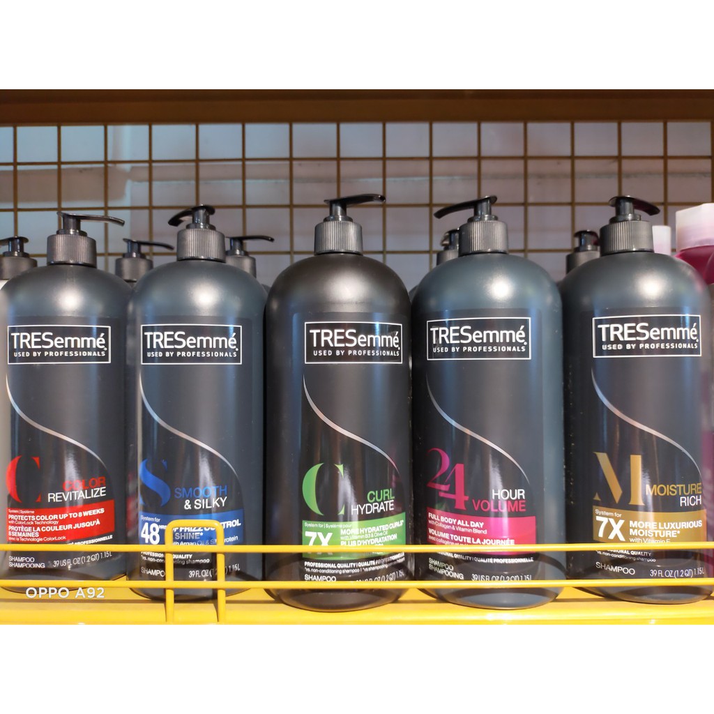 - Dầu Gội TRESemme Shampoo 1.15L - PROTECTION(đỏ) là sản phẩm chuyên hỗ trợ dành cho tóc nhuộm. với công thức tiên tiến giúp cho màu tóc nhuộm bền màu gồm: trà xanh, hoa hướng dương, và hoa hồng làm sạch nhẹ nhàng, làm ẩm tóc, và giúp chăm sóc tóc của bạn. Thêm vào đó, nó giúp chống lại sự khô tóc và làm tăng thêm vẻ sáng mượt cho tóc. Các tác nhân xấu từ môi trường như nắng gắt, khói bụi, không khí ô nhiễm… dễ làm tóc bạn bị hư tổn, khô ráp, gãy rụng, ngứa và gàu. Giúp tóc phục hồi nhanh chỉ sau một vài lần gội. - Dầu Gội TRESemme Shampoo 1.15L - HOUR VOLUME(hồng) dòng này giúp tóc dày,ngăn ngừa tình trạng gãy rụng Công thức 24 giờ hỗ trợ cung cấp chức năng điều hòa cho tóc, tránh tình trạng tóc bết dính, kiểm soát lượng protein, giúp tóc luôn suôn thẳng tự nhiên. Nhờ đó mái tóc luôn bồng bềnh và dày hơn trông thấy, duy trì được độ phồng và bồng bềnh cho tóc với độ phồng tự nhiên theo cấu trúc tự nhiên của tóc, giúp bạn dễ quản lý mái tóc mà tóc không bị xẹp xuống và cung cấp độ dưỡng ẩm phù hợp. Công thức nhẹ dịu phù hợp sử dụng hằng ngày. - Dầu Gội TRESemme Shampoo 1.15L - CULR HYDRATING(xanh lá) là sản phẩm chuyên hỗ trợ dành cho tóc xoăn. là sản phẩm lý tưởng cho các kiểu tóc xoăn tự nhiên hay do uốn và gợn sóng với công thức giàu Vitamin B1, B3, C, phức hợp Vitamin E, Biotin, Keratin cùng chiết xuất tinh dầu chanh. TRESEMME CURLS CULR HYDRATING (xanh lá)có tác dụng hỗ trợ giữ cho các lọn tóc luôn mềm mại và bạn sẽ cảm nhận được các lọn tóc uốn của mình nhẹ hơn bao giờ hết. Đặc biệt, nó còn là thần dược giúp chống rụng tóc rất hiệu quả. Tóc bạn sẽ luôn bóng mượt, chắc khỏe và đầy sức sống. - Dầu Gội TRESemme Shampoo 1.15L - SMOOTH & SILKY (xanh dương) đặc biệt lý tưởng dành cho tóc khô, hư tổn, dễ gãy do xử lý hóa chất hay nhiệt. được bổ sung dưỡng chất Vitamin H và chiết suất tơ tằm giúp làm cho tóc bóng khỏe và mềm mượt. Nhiều vitamin và chất đạm làm sạch tóc nhẹ nhàng. Luôn duy trì cho tóc được sạch khỏe, mềm mại. - Dầu Gội TRESemme Shampoo 1.15L - MOISTURE RICH (vàng) phục hồi cho tóc dùng nhiều hóa chất hay nhiệt, dưỡng ẩm siêu mềm mượt. được bổ sung dưỡng chất, Vitamin E và chiết xuất từ hướng dương, hạt phỉ và hạnh nhân, đặc biệt lý tưởng cho tóc khô, tóc hư tổn do xử lý hóa chất hay nhiệt. Công thức dịu nhẹ nhưng đủ để thỏa mãn cơn khát cho mái tóc, đồng thời làm cho tóc bóng khỏe và mềm mượt. Đem lại cho bạn một màu tóc lâu bền ( tóc nhuộm ) gấp 5 lần. Sản phẩm làm thẳng, ngăn chặn sự bay màu và rối tóc, để tóc vào nếp với các hỗn hợp giữ ẩm. Với hệ thống bảo vệ màu tóc sẽ loại bỏ đi vẻ phai màu, mờ nhạt của tóc bằng cách tráp thêm lớp bảo vệ không có trong thuốc nhuộm và giữ lại các chất khoáng cho tóc.