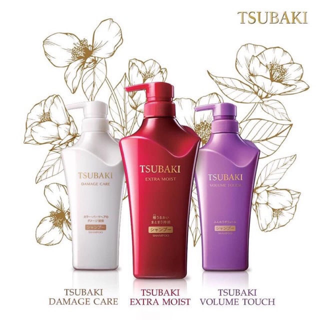 Dầu gội Tsubaki trắng – Shiseido Tsubaki Damage Care Dầu gội Tsubaki trắng chuyên dành phục hồi tóc hư tổn, tóc khô, chẻ ngọn đặc biệt là đối với các loại tóc dùng nhiều hóa chất. Sản phẩm ngoài công dụng phục hồi tóc còn có tác dụng bảo vệ tóc khỏi tác hại của tia cực tím. 03 bước phục hồi tóc hư tổn với Tsubaki trắng như sau: 1. Gội sạch tóc bằng Tsubaki Tsubaki Damage Care. 2. Xả sạch với nước, chăm sóc tóc bằng dầu xả Tsubaki conditioner. 3. Tuần một lần dùng ủ dưỡng cho tóc Dầu gội Tsubaki vàng – shiseido Tsubaki Head Spa (dành cho các spa) Tsubaki màu vàng giúp làm sạch tóc, nâng niu và bảo vệ máy tóc của bạn, giúp bạn có những giờ phút thư giãn cùng máy tóc như tại các spa. Thành phần dầu gội Tsubaki vàng: Bạch trà, Hoa Hồng, Cúc Vạn Thọ và Quế 03 bước thư giản tại nhà với tsubaki màu vàng 1. Gội sạch tóc bằng Tsubaki Head spa shampoo. 2. Xả sạch với nước. Gội lần 2 với Tsubaki Headspa Extra Cleansing Essential oil, tác dụng làm sạch và thư giãn sâu (tuần 1 lần) 3. Xả sạch với nước. Dưỡng tóc bằng Tsubaki Headspa conditioner. (*) Tuần một lần dùng ủ dưỡng với mặt nạ cho tóc Tsubaki Headspa Massage Spa Mask with Essential oil.