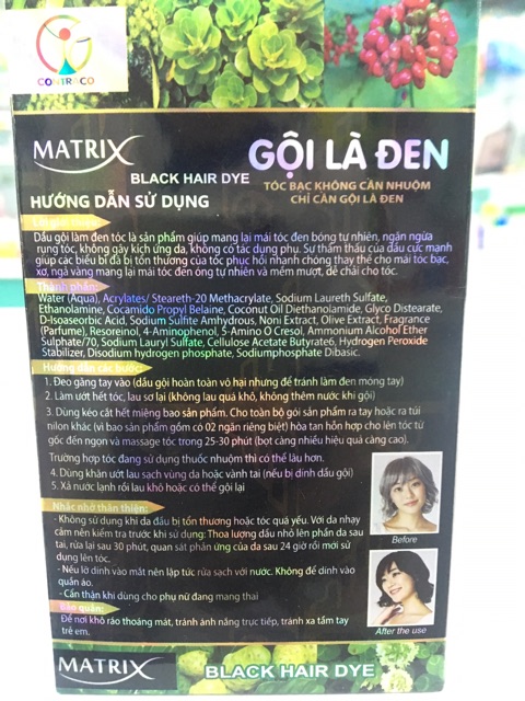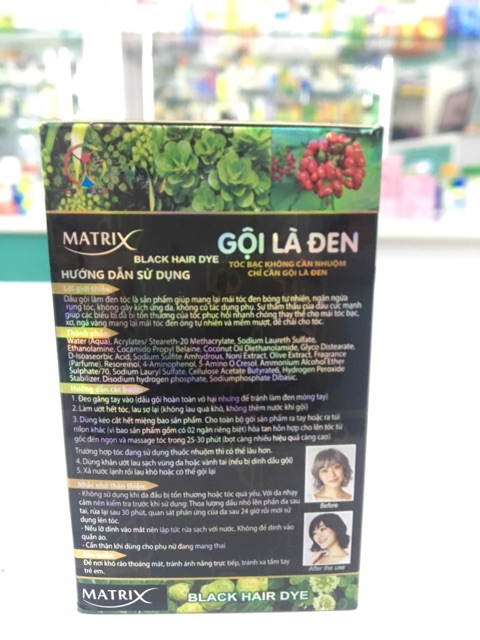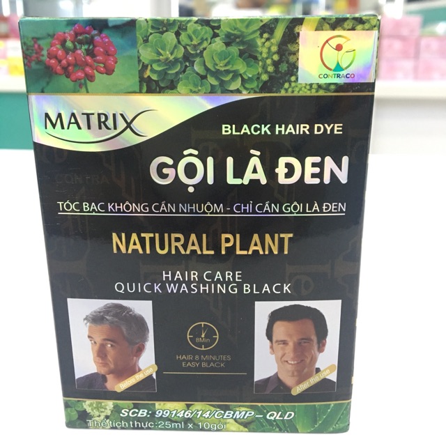 Gội là đen thảo dược Maxtrix Dầu gội là đen là sản phẩm giúp mang lại mái tóc đen bóng tự nhiên, ngăn ngừa rụng tóc , không kích ứng da, không tác dụng phụ. Sự thẩm thấu của dầu cực mạnh giúp các biểu bì bị tổn thương của tóc phục hồi nhanh chóng thay thế cho mái tóc bạc, xơ, ngả vàng mang lại mái tóc đen óng tự nhiên, dễ chải tóc Hướng dẫn sử dụng: 1. Cắt ngang miệng giis, đổ dầu gội ra đĩa( chén) và trộn thật kỹ, thật đều 2 hỗn hợp, bên trong gói dầu. 2. Bôi thật kỹ và tật đều lên tóc, ưu tiên vùng tóc bạc, sau đó massage từ 5 đến 7 phút. Sau thời gian massage phải chờ 10 phút nữa rồi xả tóc bằng nước sạch Lưu ý: Sau 24-48 giờ mới gội lại bằng dầu gội bình thường.