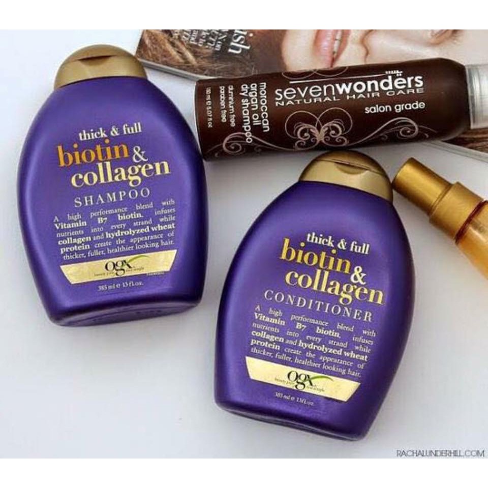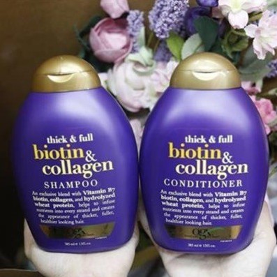 DẦU GỘI BIOTIN&COLLAGEN THICK&FULL chống rụng tóc, kích thích mọc tóc 👉 Hiệu quả cực kì! Mẹ nào mới sinh xong nhớ thủ 1 em trong nhà nha. Mùi rất Tây luôn 💕 ĐỘI NÀO TÓC THƯA - TÓC MỎNG - TÓC KHÔ-XƠ XÁC- DỄ GÃY- RỤNG NHIỀU VỀ NGAY NHÀ EM NHÉ 🍃🍃Dầu gội chăm sóc tóc OGX Biotin & Collagen phù hợp với những ai ? 🔹Những Mom có tóc yếu gãy rụng trước và sau khi sinh. 🔹Những người tóc yếu, giòn, dễ đứt gãy do thiếu chất 🔹Da đầu thường xuất hiện bã nhờn, tóc kém độ bồng bềnh. 🔹Những ai dị ứng với thành phần hóa chất ngành tóc quá nhiều trong sản phẩm gội thông thường. 🔹Không khí ngày càng ô nhiễm khiến cho da đầu bạn nhanh bám bụi bẩn, sử dụng nhiều các loại chất nhuộm tóc, uỗn, duỗi… làm tóc bạn ngày càng hư tổn, xơ rối, gãy rụng. 💕 Dầu gội và xả Biotin Collagen là cách dễ dàng, hiệu quả nhất giúp tóc khỏe mạnh, đầy sức sống. ☘️Tinh chất collagen, ProVitamin B7, biotin và các dưỡng chất giữ ẩm cho tóc ☘️Không chứa chất bảo quản paraben và chất tạo bọt sulfates gây ung thư như các loại dầu gội thông thường. Đạt tiêu chuẩn của cục quản lí Thực phẩm và Dược phẩm ĐỨC 💕TÁC DỤNG CỦA DẦU GỘI VÀ XẢ THICK & FULL BIOTIN COLLAGEN 👍Giảm thiểu quá trình tiết bã nhờn ở chân tóc 👍Giúp phục hồi tóc yếu và gãy rụng 👍Cung cấp dưỡng chất Vitamin B7 Biotin và Collagen giúp tóc dày và mượt hơn 👍Hương thơm dịu nhẹ, tươi mát mang lại cảm giác thư giãn. 👍Kích thích mọc tóc con giúp tóc dày lên và chắc khỏe. 🌿100% Organic là thực phẩm hữu cơ được chiết xuất hoàn toàn từ thảo dược thiên nhiên, không chứa một tí chất thêm nào. 🌿Chất Collagen có tác dụng làm kích thích mọc tóc, các protein được thủy phân từ lúa mì giúp tóc ngày càng khỏe mạnh, đầy hơn và tràn đầy sức sống. 🌿Bổ sung độ ẩm, tăng sự đàn hồi, dẻo dai của sợi tóc 🌿Ngăn ngừa lão hóa của tóc. Giúp sợi tóc khỏe, sáng bóng mượt hơn nhiều lần. 🌿Bổ sung axit amin, khoáng chất cần thiết cho tóc để giúp tóc bóng mượt và ngăn gãy rụng. 🌿Lưu giữ hương thơm lâu- Mùi thơm rất Tây.