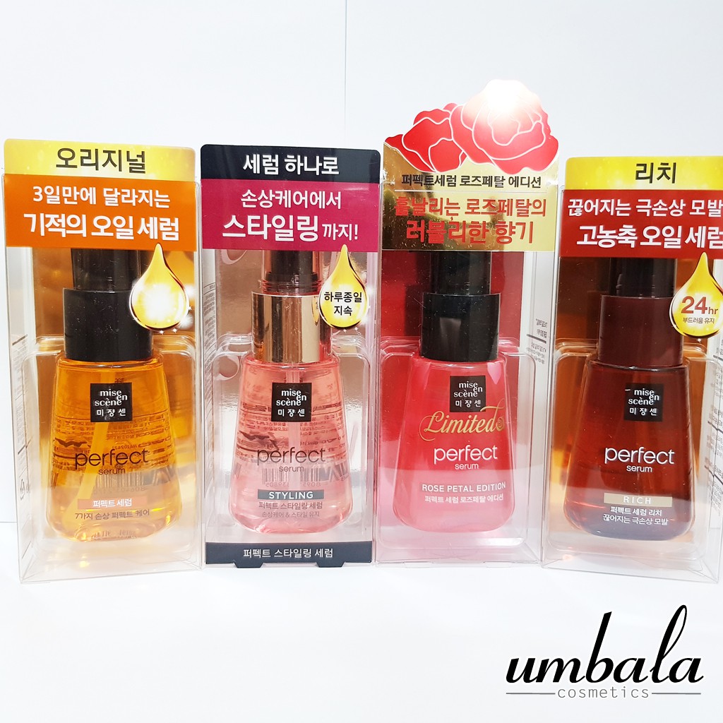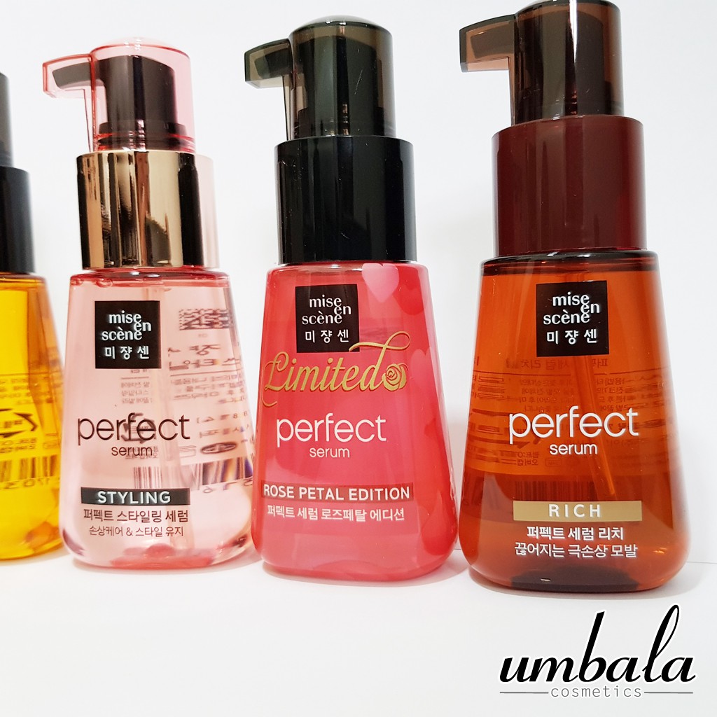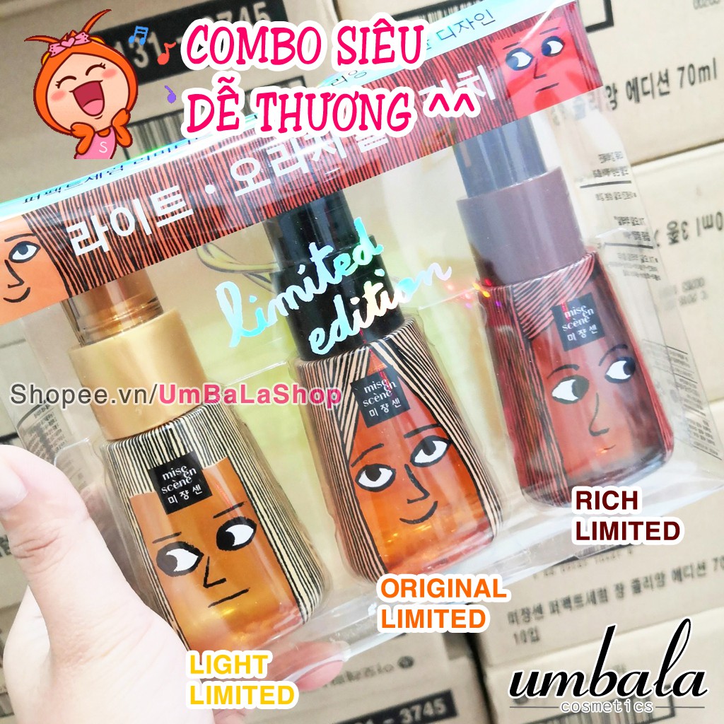 Serum dưỡng tóc Mise en scène gây được tiếng vang khi đạt giải thưởng Cosmo Beauty Awards Châu Á 2011 Mise en scène - Thương hiệu chăm sóc tóc ở Hàn Quốc ra mắt vào năm 2011 - thuộc tập đoàn Amore Pacific. Tinh chất dưỡng tóc Mise en scène rất được “hồ ly” Shin Min Ah và Jeon Ji Huyn yêu thích nữa đấy các bạn! 1. Bao bì, thiết kế - Vỏ chai bằng nhựa trong có thể nhìn thấy dung dịch bên trong. Chai có vòi bơm có thể kiểm soát được dung dịch lấy ra. - Có nắp bảo vệ đầu bơm chắc chắn, bạn có thể mang đi mà không lo bị đổ tràn ra ngoài. - Thành phần: Dầu argan có Vitamin E giúp tóc chắc khỏe. Dưỡng ẩm tóc, khắc phục tình trạng tóc hư tổn do uốn, nhuộm, duỗi. Các biotin có trong sữa ong chúa giúp tóc mọc lại nhanh hơn và khỏe hơn. Các protein và axit amin còn giúp trẻ hóa da đầu và hỗ trợ trong việc phục hồi tóc hư tổn. Nước hoa hồng giúp tóc mềm mại, bóng đẹp và khỏe mạnh hơn. 2. Công dụng: - Phục hồi tóc khô, chẻ ngọn và bị hư tổn từ nhẹ đến nặng - Bảo vệ lưu giữ mái tóc càng thêm óng mượt với hiệu ứng 3D đẹp từ mọi góc nhìn. Mise en scène cam kết bạn sẽ được trải nghiệm hiệu ứng này chỉ trong vòng 7 ngày. 3. Cách sử dụng: - Có thể dùng khi tóc ướt hoặc đã khô. - Dùng khi tóc còn ướt: Sau khi gội đầu và để khô khoảng 80%, lấy 1 – 2 lần nhấn serum thoa lên đuôi tóc. Massage nhẹ nhàng để serum thấm vào tóc. - Dùng khi tóc khô: Thoa đều lượng serum lên đuôi tóc, massage nhẹ nhàng và tập trung nhiều hơn ở vùng tóc bị hư tổn. - Không nên lấy quá nhiều serum vì sẽ làm bết tóc. - Thoa tập trung phần thân và đuôi tóc, không nên thoa gần vùng chân tóc sẽ làm da đầu bị bết dính. - Có thể thoa lại khi tóc đã khô lại hoàn toàn để đạt kết quả tốt nhất. - Tần suất: 1 – 2 lần nhấn/lần sử dụng. 4. Cảm nhận sau khi dùng: - Thiết kế thông minh với nắp bảo vệ chắc chắn có thể cho vào túi xách mà không sợ bị đổ tràn ra ngoài. - Serum màu vàng nhạt, khá đặc. Khi dùng sẽ cảm thấy thấy hơi nhờn nhưng không bị dính đâu nhé. - Khi thoa lên tóc lập tức cảm giác được tóc mềm và mượt hơn hẳn. Để có hiệu quả tốt nhất các bạn nên thường xuyên sử dụng. - Mùi hương nhẹ nhàng, dễ chịu, không bị nồng. - Tóc mình sau khi uốn phần đuôi có dấu hiệu bị khô nên sau khi dùng được khoảng 2 tháng và tóc mình đã không còn bị khô, tóc mềm mượt hơn hẳn. - Mỗi lần sử dụng 2 lần nhấn nên tóc không bị bết dính và hiệu quả như mong đợi. - Sau khi thoa lên tóc cần phải massage 2 – 3 phút để serum thấm vào tóc. - Chỉ có hiệu quả lập tức, nếu muốn tóc khỏe cần sử dụng thường xuyên và lâu dài. Với 6 tùy chọn dành cho: #1 ORGINAL: Dòng cơ bản, best seller, dùng cho mọi tóc #2 ROSE: Phiên bản từ dòng ORGINAL, có hương hoa hồng quyến rũ #3 RICH: Cho tóc hư tổn nhiều, chẻ ngọn, tóc uốn, tóc tẩy, tóc khô xơ. #4 STYLING: Dưỡng + hỗ trợ giữ nếp cho tóc tạo kiểu . Sử dụng cả trước và sau khi tạo kiểu tóc để đạt hiệu quả tốt nhất. #5 LIGHT: Cho tóc ít hư tổn, kết cấu lỏng nhẹ nhất trong 6 loại. #6 ESSENCE: Dưỡng tóc với dạng sữa ,cung cấp đủ độ ẩm cho tóc luôn óng mượt ,không bị bết và đổ dầu, đậm đặc.