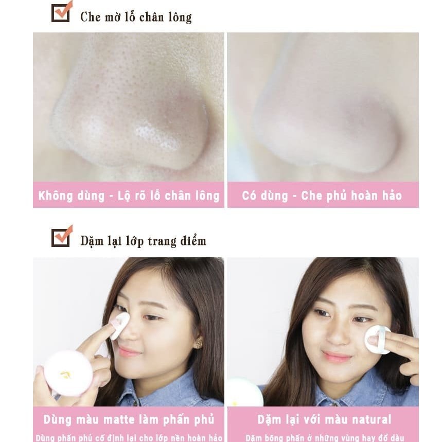 ☀️BỘT PHẤN ĐƯỢC CHIẾT XUẤT TỪ THỰC VẬT THIÊN NHIÊN, KHÔNG GÂY MẪN CẢM VÀ HẠI DA. CHỨA NHIỀU YẾU TỐ KIỂM SOÁT DA DẦU, HẤP THỤ VÀ KIỂM SOÁT DA DẦU LÂU DÀI. ☀️02 LỚP THẨM THẤU DA DẦU >> ☀️ĐEM ĐẾN CHO DA CẢM GIÁC MỀM MỊN, THAY THẾ PHẤN PHỦ DẶM LỚP TRANG ĐIỂM, HÚT VÀ KIỀM DẦU CỰC TỐT. ☀️PHẤN SẼ HÚT SẠCH DẦU TRÊN DA CHO DA THOÁNG KHÍ, KHÔNG TẠO LỚP BÓNG NHỜ KHI TRANG ĐIỂM CẢ NGÀY. ☀️THIẾT KẾ HỘP SIÊU CUTE, GỌN NHẸ, CÓ THỂ ĐEM ĐI KHẮP MỌI NƠI. ##Tím nhạt: tone matte màu da ##Xanh: tone natural trắng trong