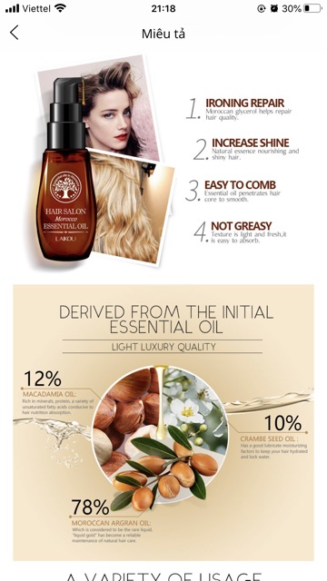 📌 Giải pháp cho các chị em có tóc bị hư tổn do sử dụng nhiều hóa chất uốn, nhuộm... 📌 Tác dụng của tinh dầu: phục hồi tóc hư tổn, chẻ ngọn, tăng độ bóng giúp tóc mềm mượt không bị xơ rối. 📌 Chai dạng xịt: 40ml. Chất dầu nhẹ, màu vàng nhạt, mùi thơm dễ chịu, sau khi apply lên tóc không rửa tay lại cũng không cảm thấy nhớt dính đâu hen. 📌Thành phần bao gồm: ✅ 12% dầu macadamia (hạt mác ca) : giàu khoáng chất, protein, nhiều loại axit béo không bão hòa có lợi cho việc hấp thụ dinh dưỡng cho tóc ✅ 10% dầu hạt crambe: giàu chất dưỡng ẩm giúp tóc luôn bóng mượt. ✅ 78% dầu hạt argan oil : chứa nhiều Vitamin E, chất chống oxy hóa giúp nuôi dưỡng, phục hồi tóc hư tổn. 📌 HƯỚNG DẪN SỬ DỤNG 🌹🌹🌹 ☘️ Cách 1: Sau khi gội đầu, lau khô bằng khăn. Khi tóc còn hơi ẩm, chia tóc ra thành 2,3 phần, lấy 1 chút dầu ra tay, dùng 2 bàn tay xoa đều dầu rồi nhẹ nhàng thoa lên từng phần tóc đã chia nhỏ (tập trung chủ yếu phần thân và ngọn tóc hư tổn nhé). Cuối cùng sấy khô tóc là bạn đã có mái tóc suôn mềm và bóng tự nhiên suốt cả ngày. ☘️ Cách 2: Dùng như dầu ủ tóc, thoa dầu lên phần chân tóc, ủ 20-30 phút rồi gội đầu như bình thường. ❄️❄️❄️❄️❄️❄️❄️❄️ ✅Về sản phẩm: Shop cam kết cả về CHẤT DÁNG ( đúng với những gì được nêu bật trong phần mô tả sản phẩm). Video chỉ để tham khảo cách sử dụng của sản phẩm. ✅Về giá cả : Shop nhập với số lượng nhiều và trực tiếp nên chi phí sẽ là RẺ NHẤT nhé. ✅Về dịch vụ: Shop sẽ cố gắng trả lời hết những thắc mắc xoay quanh sản phẩm nhé. ✅Thời gian chuẩn bị hàng: Hàng có sẵn, thời gian chuẩn bị tối ưu nhất. Liên hệ shop: - Hotline: 0️⃣9️⃣0️⃣6️⃣6️⃣0️⃣4️⃣6️⃣0️⃣3️⃣ - Địa chỉ/ kho: Bình Tân, Tân Phú - Zalo: 0906 604 603