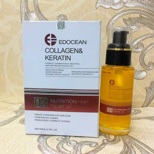 TINH DẦU DƯỠNG TÓC COLLAGEN-KARATIN EDOCEAN 60ML Công dụng Sản phẩm được chiết xuất từ tinh dầu hạt Aigan Jojoba và các thành phaafnthieen nhiên collagen và karatin làm cho mái tóc mềm mại, tái tạo tóc hư tổn và làm bóng tức thì phục hồi từ sâu bên trong . Đặc