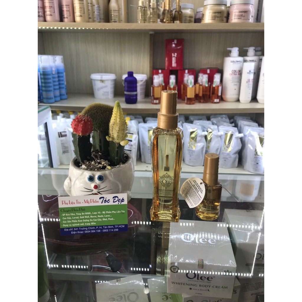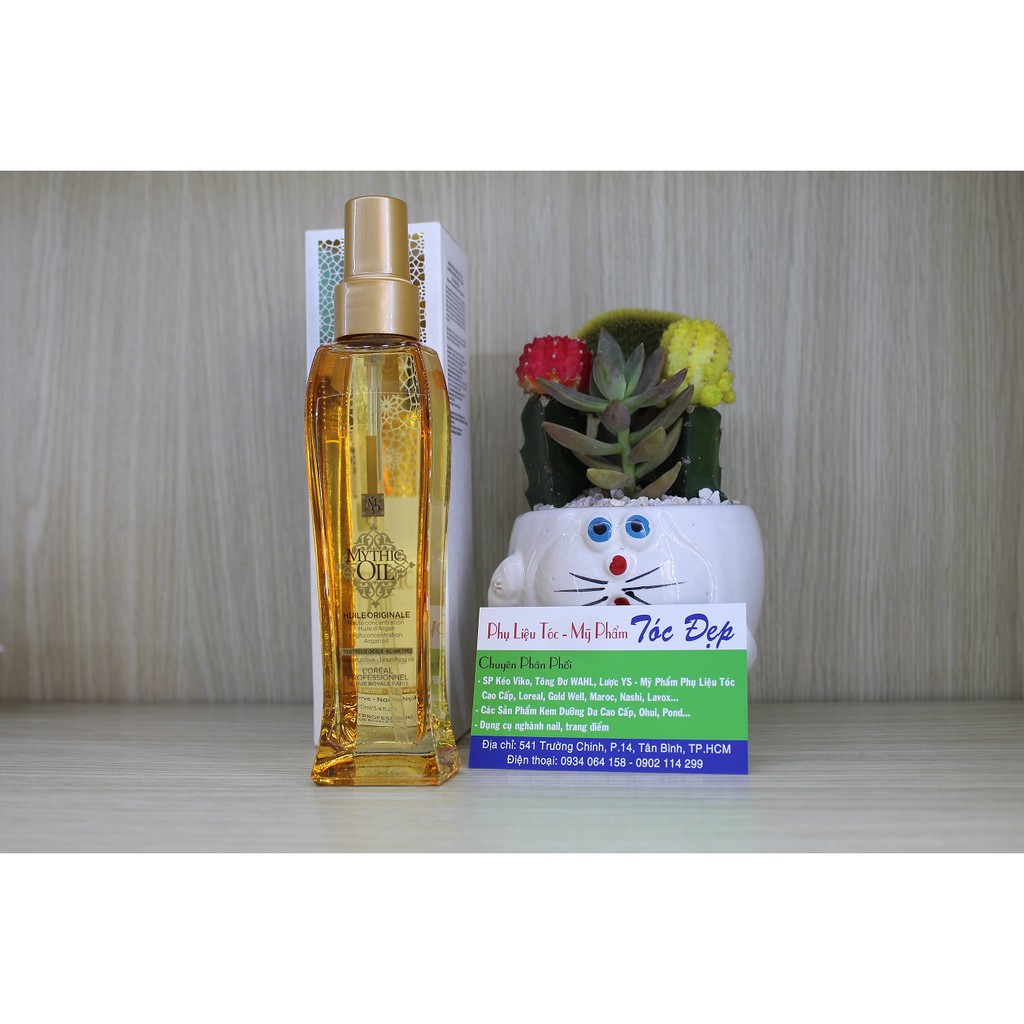 TINH DẦU DƯỠNG TÓC CHỐNG RỐI, NUÔI DƯỠNG TÓC SUÔN MỀM MƯỢT MYTHIC OIL L'OREAL CAO CẤP 100ML Tinh dầu Mythic Oil L'oreal - dầu dưỡng tóc đặc biệt khai thác sức mạnh của thế giới tinh dầu thiên nhiên huyền thoại, mang lại những hiệu quả tuyệt vời cho mái tóc óng mượt và bóng khỏe tự nhiên, tránh chẻ ngọn và khô xơ. + 3 bí mật về dầu dưỡng tóc Mythic: - Nuôi dưỡng tóc nhờ tinh dầu trái bơ và tinh dầu hạt nho giàu vitamin E và các axit béo, chứa nhiều Vitamin A, B1, B2, D và A-xít béo Omega 3,6 và 9 chống lại sự oxy hóa, làm chậm quá trình lão hóa của tóc, giúp tóc luôn tràn đầy sức sống và tươi mới. - Thẩm thấu cực nhanh: Do dầu loãng nên lương dầu nhanh chóng thấm sâu vào tóc, nuôi dưỡng tóc hoàn hảo, làm tóc trở nên sáng bóng và không gây ra bất kỳ sự nhờn rít hay bết tóc. - Đa công dụng: Dầu Mythic huyền thoại có tác dụng phục hồi tóc hư tổn, làm bóng tóc, hay chống lại tác động của nhiệt độ máy là, sấy,... Thành phần: Chiết xuất thiên nhiên từ dầu quả bơ và tinh dầu hạt nho.