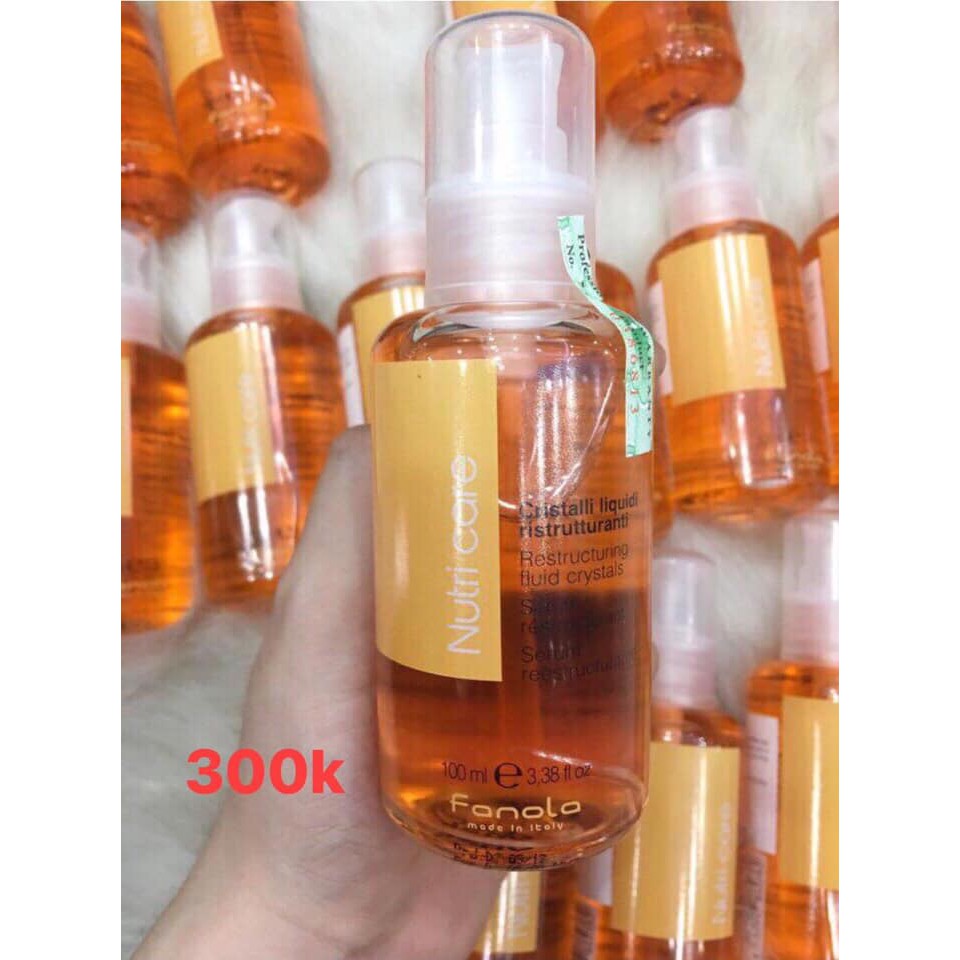 SERUM DƯỠNG TÓC NUTRICARE FANOLA💧 ↪️ Xuất xứ: Ý ↪️Dung tích: 100ml 💰Giá: #290k/sp 💧Tinh dầu Fanola dưỡng tóc điều trị và phục hồi với Aloe Vera và tinh dầu hạt lanh, sản phẩm mang lại mái tóc sáng bóng và giúp tóc dễ tạo kiểu. Được đặc chế thích hợp với tóc quăn, xoắn và tóc uốn. 💦 Tinh dầu Fanola Nutri Care còn chữa được tóc chẻ ngọn , giúp tóc không bị bệt lại, không bám bụi và trở nên sống động hơn. 🍃Công dụng: ➡️Tinh dầu Fanola Nutri care dưỡng tóc điều trị và phục hồi với Aloe Vera và tinh dầu hạt lanh, sản phẩm mang lại mái tóc sáng bóng và giúp tóc dễ tạo kiểu. ➡️Được đặc chế thích hợp với tóc quăn, xoắn và tóc uốn. ➡️Sản phẩm tinh dầu Fanola còn chữa được tóc chẻ ngọn; giúp tóc không bị bệt lại, không bám bụi và trở nên sống động hơn. 🖌Cách dùng: 👉🏽Dùng khi tóc còn ẩm để tạo kiểu và cho tóc vào nếp. 👉🏽Dùng trước khi sấy để bảo vệ tóc không bị nhiệt làm khô xơ. 💦Cho một lượng tinh dầu vừa đủ 3 – 4 giọt vào lòng bàn tay, xoa đều và thoa lên tóc ẩm, massage nhẹ nhàng tr
