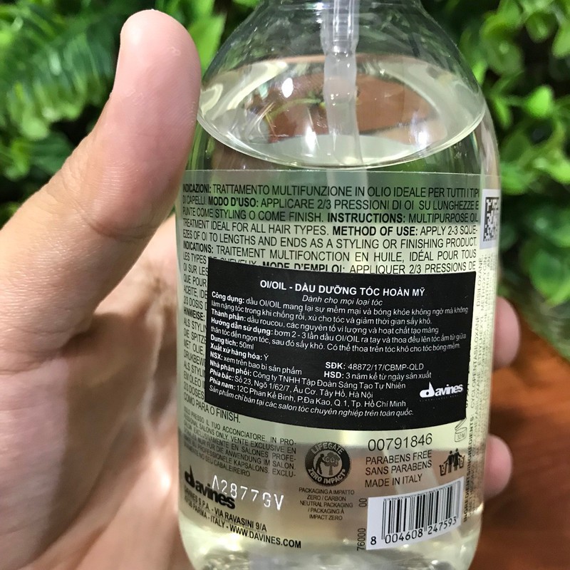 Lợi ích: mang đến độ bóng và mềm đặc biệt cho tóc hoạt động gỡ rối và tái tạo cấu trúc chống rối xù hoạt động chống oxy hóa và chống gốc tự do mạnh CÁCH SỬ DỤNG: Cho tác dụng chống rối xù, bơm 2-3 lần dầu OI / OIL ra tay, thoa đều lên phần thân và ngọn tóc ẩm, rồi sấy. Cho hiệu ứng bóng và mềm, bơm 2-3 lần dầu OI / OIL ra tay, thoa lên phần thân và ngọn tóc khô. Lượng dầu sử dụng có thể thay đổi tùy theo từng loại tóc: chỉ sử dụng 1 lần bơm cho tóc mỏng, trong trường hợp tóc vừa hoặc dày, bắt đầu với 2 đến 3 lần bơm, sau đó dùng thêm nếu cần thiết. CÁC CỠ SẢN PHẨM: 50 ml, 135 ml THÀNH PHẦN HOẠT ĐỘNG TỰ NHIÊN: Dầu Roucou - chống lão hóa, chống gốc tự do mạnh; Silicon tự thở - tạo lớp màng bảo vệ cho mọi loại tóc; Lần đầu ra mắt tại Cosmoprof 2011 OI / OIL hiện là sản phẩm số 1 của Davines. OI /OIL là sản phẩm Vô Hại.