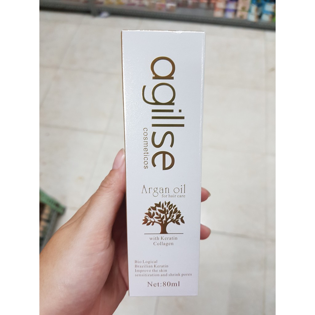 Tinh dầu dưỡng tóc agillse Argan Oil được chiết hoàn toàn từ dầu Argan thiên nhiên mang đến cho bạn mái tóc mềm mượt, khỏe manh. Với công thức hoạt động vượt trội, bổ sung vitamin B5, Keratin, collagen và các axit amin phục hồi mái tóc hư tổn và bảo vệ sợi tóc khỏi tác động của môi trường, hóa chất. Tinh dầu dưỡng tóc agillse Argan Oil hương thơm nước hoa quyến rũ khó phai lên đến 72 tiếng. Công dụng: Hương thơm nước hoa quyến rũ khó phai lên đến 72 tiếng Dầu Argan từ thiên nhiên chứa nhiều vitamin và axit amin giúp mái tóc mượt mà, đen bóng và mềm mại Công thức hoạt động manh mẽ với Vitamin B5, Keratin, Collagen và các axit amin phục hồi mái tóc hư tổn và bảo vệ tóc khỏi tác động của môi trường và hóa chất Bổ sung độ ẩm và các chất dinh dưỡng nuôi dưỡng và phục hồi mái tóc hư tổn Tăng cường độ ẩm cho mái tóc, giúp sợi tóc không còn khô xơ, xoăn xù Hướng dẫn sử dụng: Bước 1: Gội đầu sau đó thấm khô tóc bằng khan bông Bước 2: Lấy một lượng dầu vừa đủ. Xoa đều lòng bàn tay và vuốt nhẹ lên tóc. Bước 3: Dùng lược chải đều từ đỉnh đầu xuống ngọn tóc để dầu thẩm thấu đều các sợi tóc. Bước 4: Dùng máy sấy để sấy cho tóc khô. Bước 5: Có thể lấy thêm 1-2 giọt tùy độ dày và dài của tóc hoặc thoa lên tóc khô để tạo độ bóng và tăng cường cho phần đuôi tóc bị hư tổn.