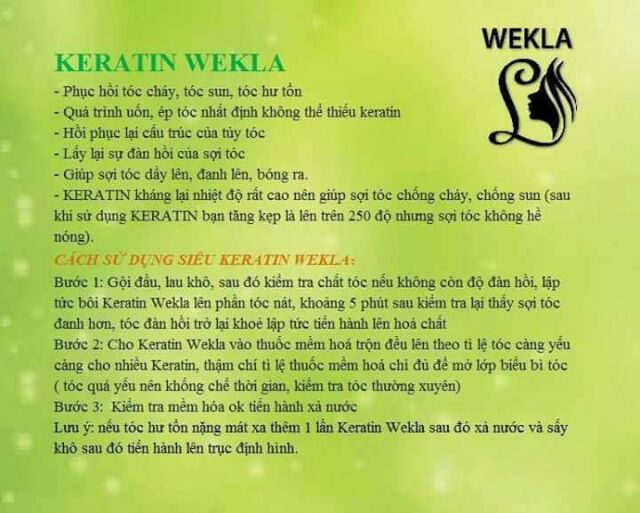 KERATIN WEKLA là một thành phần chiếm tới 70% trong cấu tạo tóc Karatin chính là một loại protein có tác dụng bảo vệ tóc tránh khỏi những hư tổn và kéo dài vẻ đẹp chotóc. Khi tóc được bổ sung keratin, chất này sẽ làm đầy các khoảng trống bị mất trong biểu bì tóc giúp tóc khỏe mạnh và cải thiện được các vấn đề như tóc gãy, tóc rối, hư tổn vì sử dụng nhiều hóa chất…