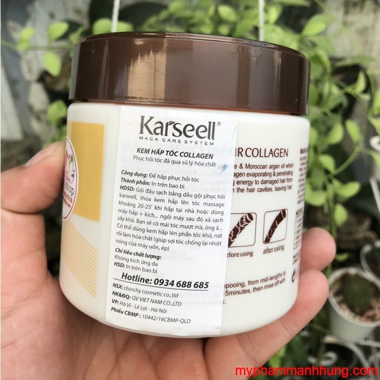 Cách phân biệt hàng thật - giả: - Hàng chính hãng có đầy đủ tem chống hàng giả ở cổ túi, tem điện tử ở thân túi - Date in laze - dập nổi chữ karseell ở viền túi - Dầu hấp tóc Collagen là dịch vụ mới trong tương lai thay thế cho dịch vụ hấp dầu truyền thống, vì ưu điểm, giúp cho tóc mềm mượt hơn, bóng hơn và phục hồi hư tổn nhanh hơn. Công dụng: Sử dụng hấp dưỡng cho mái tóc khô hư tổn, với thành phần collagen giúp phục hồi độ ẩm và độ bóng mượt cho mái tóc. Cách sử dụng: Lấy một lượng vừa đủ kêm hấp tóc Karseell Maca pha tỉ lệ 1:1 với nước ấm hòa tan, bôi lên tóc quấn khăn, để tự nhiên hoặc dùng máy kích nhiệt khoảng 10 – 20ph. Sau đó xả sạch rồi sấy khô tạo kiểu. Nên sử dụng kết hợp dầu gội xả collagen Karseell Maca để phát huy hiệu quả tối ưu. Thông tin hãng: Maca Power Karseell là dòng sản phẩm chuyên nghiệp cho Salon với các sản phẩm nổi bật như: Hấp collagen Karseell siêu mềm mượt giúp phục hồi tóc hư tổn, làm mềm và bóng mượt tóc. Dầu gội xả collagen chăm sóc tóc hư tổn hàng ngày, mùi thơm quý phái. Kem keratin phục hồi tóc hư tổn, bảo vệ làm dai chắc sợi tóc trước khi lên hóa chất. Sản xuất: Karseell Co.,Ltd
