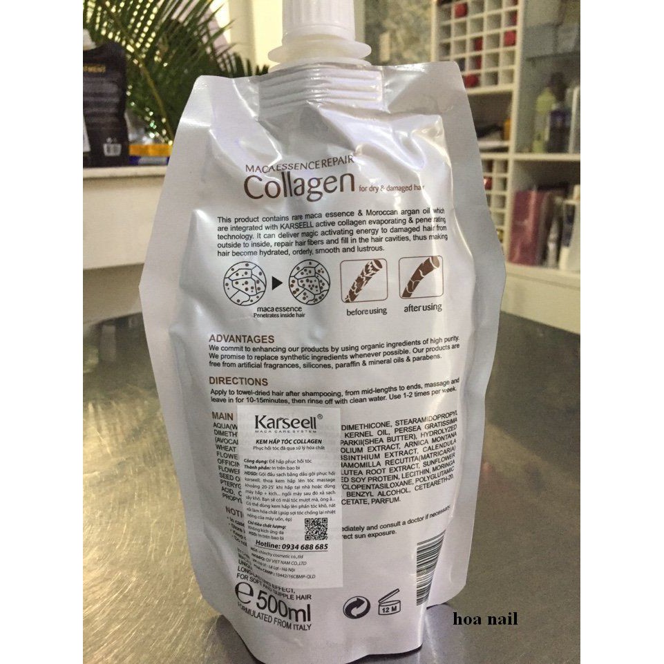 Shop mình cảm ơn quý khách ghé thăm. Mong quý khách mua hàng ủng hộ shop ạ. HẤP DẦU COLLAGEN KARSEELL MACA POWER 500ML PHỤC HỒI TÓC HƯ TỔN HIỆU QUẢ THẾ NÀO? Hấp dầu Collagen Karseell 500ml Sản phẩm được làm từ các thành phần tự nhiên, trong đó gồm nhiều vitamin, protein và khoáng chất cùng với thành phần collagen giúp phục hồi độ ẩm có tác dụng bảo vệ cho chân tóc; sửa chữa và khôi phục lại lớp biểu bì tóc bị hư hỏng Hướng dẫn sử dụng Hấp ủ tóc Collagen đúng cách: để có thể len lỏi vào từng biểu bì tóc tái tạo lại chất sừng cho tóc làm cho sợi tóc chắc khỏe, đặc biệt những mái tóc đã làm qua hóa chất nhiều lần như nhuộm, uốn ,duỗi, khi làm hóa chất nhiều tóc của bạn sẽ bị hư tổn nặng, tóc trở nên yếu,khô xơ, mủn, chỉ cần hấp 1 lần ngâm trong collagen trong vòng 15p tóc lại khỏe như tóc tự nhiên, phục hồi những mái tóc hư tổn nhất. Sau khi gội đầu sạch, lấy một lượng vừa đủ kêm hấp tóc Karseell Maca pha tỉ lệ 1:1 với nước ấm hòa tan, bôi lên tóc quấn khăn, để tự nhiên hoặc dùng máy kích nhiệt khoảng 10 – 20ph. Sau đó xả sạch, rồi sấy khô, tạo kiểu. Nên sử dụng kết hợp dầu gội xả collagen Karseell Maca để phát huy hiệu quả tối ưu. Chỉ tiêu chất lượng: Không gây kích ứng da. Với các hạt dưỡng siêu nhỏ Hấp dầu Collagen Karseell Maca Power phục hồi tóc 500ml