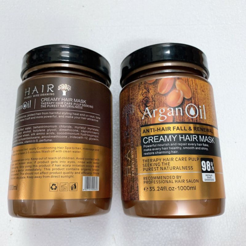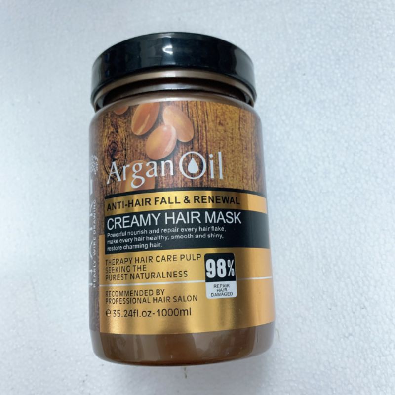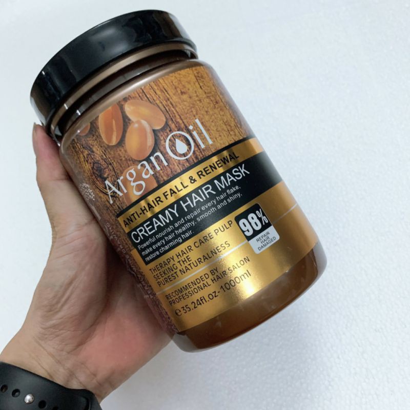 Hấp ủ Tóc Argan Oil Hair Mask 1000ml mềm mượt phục hồi - Dung tích 1000ml Đối với tóc hư tổn cần phục hồi tức thì, dầu hấp phục hồi tóc Arganoil Hair Mask là một sản phẩm trị liệu có khả năng hồi sinh chỉ trong vòng 5-7 phút, giúp tái tạo tóc và cho phép protein thấm sâu vào bên trong sợi tóc bị hư tổn do xử lý bằng hóa chất hoặc tạo kiểu bằng nhiệt. Công thức phục hồi sâu, hiệu quả cao của sản phẩm này giàu dầu argan, bơ hạt mỡ và protein có khả năng phục hồi, giúp lấy lại độ đàn hồi của tóc đồng thời củng cố sức khỏe của tóc từ trong ra ngoài. Cộng dụng: quả Argan là một loại quả quý hiếm và có những thành phần dưỡng chất như Axit amin, protein, ….giúp chăm sóc phục hồi những mái tóc chẻ ngọn, hư nát trở nên chắc khỏe và mềm mại óng ả.Cách sử dụng: sau khi gội sạch , bôi kem hấp vào phần tóc hư tổn, dùng máy hấp nóng, hấp tóc khoảng 10 phút, để nguội sau đó xả sạch nước lạnh.Chỉ tiêu chất lượng: Không gây kích ứng da.