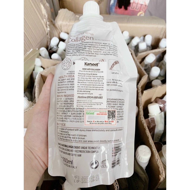 Hấp dầu phục hồi Collagen Karseell Maca được làm từ các thành phần tự nhiên, trong đó gồm nhiều vitamin, protein và khoáng chất cùng với thành phần collagen giúp phục hồi độ ẩm có tác dụng bảo vệ cho chân tóc; sửa chữa và khôi phục lại lớp biểu bì tóc bị hư hỏng; giúp tóc mềm mượt và chắc khỏe. Công dụng: Hấp dầu Collagen Karseell cung cấp dưỡng chất diệu kỳ cho tóc đã qua sử dụng hóa chất và màu nhuộm. Phục hồi tóc bị hư tổn, tóc khô xơ. Thành phần hoạt động: Các thành phần tự nhiên, gồm nhiều vitamin, protein và khoáng chất cùng với thành phần collagen. Hướng dẫn sử dụng: Sau khi gội đầu sạch, lấy một lượng vừa đủ kem hấp tóc Collagen Karseell pha tỉ lệ 1:1 với nước ấm hòa tan. Sau đó bôi lên tóc rồi quấn khăn.Bạn có thể để tự nhiên hoặc dùng máy kích nhiệt khoảng 10 – 20 phút. Sau đó xả sạch, rồi sấy khô, tạo kiểu.
