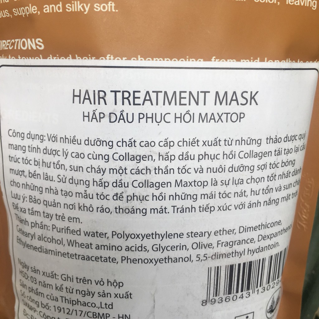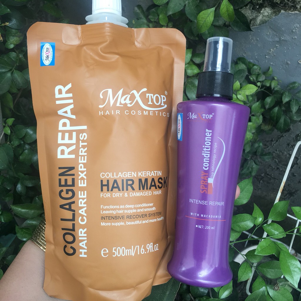 COMBO HẤP DẦU VÀ XỊT DƯỠNG SIÊU PHỤC HỒI TÓC MAXTOP Dung tích : Túi hấp 500ml + Xịt dưỡng 200ml Xuất xứ : Đức Hấp dầu collagen Maxtop được đặc chế theo công thức tiên tiến của Đức kết hợp cùng dưỡng chất chiết xuất từ Nha Đam, Keratin và thảo dược quý mang tính dược lý cao. Hồi sinh tóc Maxtop chống lão hoá, phục hồi cấu trúc bị hư tổn một cách thần tốc và nuôi dưỡng sợi tóc bền lâu mà không làm nhờn tóc. Hồi sinh tóc Maxtop là sự lựa chọn tối ưu dành cho những người thợ để phục hồi mái tóc nát, hư tổn, sun cháy. Xịt dưỡng siêu phục hồi Maxtop với thành phần : - Tinh dầu maca nhẹ và giàu các acid amin rất tốt cho tóc, tinh dầu hạt Maca giống với chất nhờn tự nhiên trên da đầu đến kỳ lạ. Kết quả là tinh dầu thẩm thấu vào chân tóc, cung cấp độ ẩm và dưỡng chất cho tóc bị hư tổn, giúp tái tạo tóc, mang lại sự óng mượt cho mái tóc. - Với tinh chất cao phân tử nhẹ nhàng thấm sâu vào tóc cung cấp dưỡng chất và độ ẩm phục hồi tóc bị tổn thương giúp sợi tóc suôn khỏe, cân bằng độ pH của tóc và đặc biệt không gây bết. - Lưu lại hương thơm nhẹ nhàng quyến rũ.