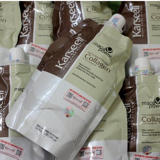 HẤP PHỤC HỒI COLLAGEN KARSEELL MACA CHÍNH HÃNG 500ML Phục hồi Collagen Karseell được làm từ các thành phần tự nhiên, trong đó gồm nhiều vitamin, protein và khoáng chất cùng với thành phần collagen giúp phục hồi độ ẩm và có tác dụng bảo vệ cho chân tóc. Collagen Karseell còn giúp sửa chữa và khôi phục lại lớp biểu bì tóc bị hư hỏng; giúp tóc mềm mượt và chắc khỏe. Công dụng: Hấp phục hồi Collagen Karseell cung cấp dưỡng chất diệu kỳ cho tóc đã qua sử dụng hóa chất và màu nhuộm Thành phần hoạt động: Các thành phần tự nhiên, gồm nhiều vitamin, protein và khoáng chất cùng với thành phần collagen. Hướng dẫn sử dụng: Sau khi gội đầu sạch, lấy một lượng vừa đủ kem hấp tóc Collagen Karseell pha tỉ lệ 1:1 với nước ấm hòa tan. Sau đó bôi lên tóc rồi quấn khăn.Bạn có thể để tự nhiên hoặc dùng máy kích nhiệt khoảng 10 – 20 phút. Sau đó xả sạch, rồi sấy khô, tạo kiểu. Nên sử dụng kết hợp dầu gội Karseell và dầu xả Karseell để phát huy hiệu quả tối ưu.