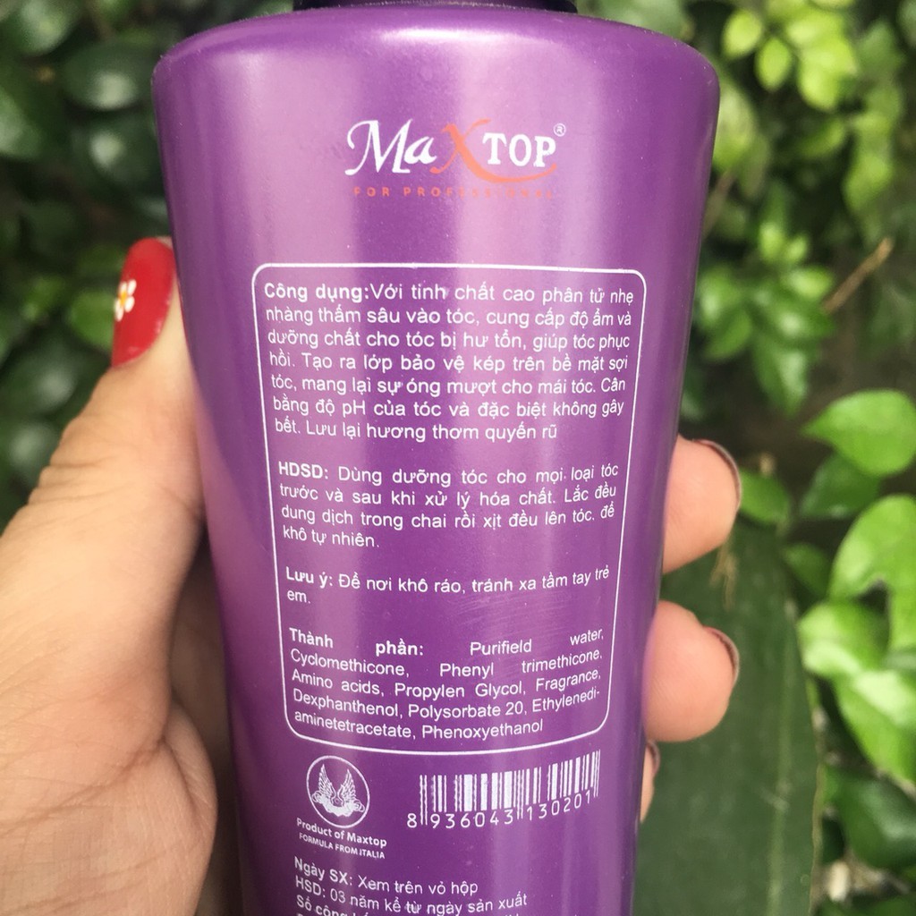 COMBO HẤP DẦU VÀ XỊT DƯỠNG SIÊU PHỤC HỒI TÓC MAXTOP Dung tích : Túi hấp 500ml + Xịt dưỡng 200ml Xuất xứ : Đức Hấp dầu collagen Maxtop được đặc chế theo công thức tiên tiến của Đức kết hợp cùng dưỡng chất chiết xuất từ Nha Đam, Keratin và thảo dược quý mang tính dược lý cao. Hồi sinh tóc Maxtop chống lão hoá, phục hồi cấu trúc bị hư tổn một cách thần tốc và nuôi dưỡng sợi tóc bền lâu mà không làm nhờn tóc. Hồi sinh tóc Maxtop là sự lựa chọn tối ưu dành cho những người thợ để phục hồi mái tóc nát, hư tổn, sun cháy. Xịt dưỡng siêu phục hồi Maxtop với thành phần : - Tinh dầu maca nhẹ và giàu các acid amin rất tốt cho tóc, tinh dầu hạt Maca giống với chất nhờn tự nhiên trên da đầu đến kỳ lạ. Kết quả là tinh dầu thẩm thấu vào chân tóc, cung cấp độ ẩm và dưỡng chất cho tóc bị hư tổn, giúp tái tạo tóc, mang lại sự óng mượt cho mái tóc. - Với tinh chất cao phân tử nhẹ nhàng thấm sâu vào tóc cung cấp dưỡng chất và độ ẩm phục hồi tóc bị tổn thương giúp sợi tóc suôn khỏe, cân bằng độ pH của tóc và đặc biệt không gây bết. - Lưu lại hương thơm nhẹ nhàng quyến rũ.