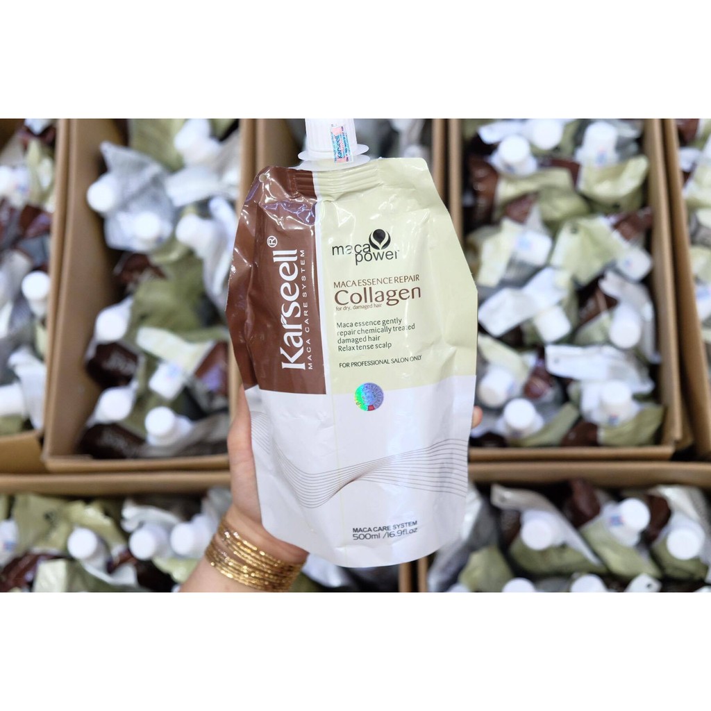Maca Power Karseell là dòng sản phẩm chuyên nghiệp cho Salon đến từ Ý với sản phẩm nổi bật như Hấp Tóc Collagen Karseell siêu mềm mượt giúp phục hồi tóc hư tổn, làm mềm và bóng mượt tóc. ☘️ Dầu hấp tóc Collagen là dịch vụ mới trong tương lai thay thế cho dịch vụ hấp dầu truyền thống, vì ưu điểm, giúp cho tóc mềm mượt hơn, bóng hơn và phục hồi hư tổn nhanh hơn. ☘️ Công dụng: Sử dụng hấp dưỡng cho mái tóc khô hư tổn, với thành phần collagen giúp phục hồi độ ẩm và độ bóng mượt cho mái tóc. ☘️ Cách sử dụng: Lấy một lượng vừa đủ kêm hấp tóc Karseell Maca pha tỉ lệ 1:1 với nước ấm hòa tan, bôi lên tóc quấn khăn, để tự nhiên 30 – 45ph hoặc dùng máy kích nhiệt khoảng 10 – 20ph.