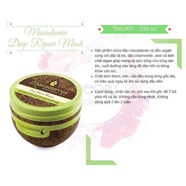 Kem hấp (dầu ủ tóc)(Mỹ) 500ML 🍃115k Từ 10 đến 50 hủ : 110k Thông tin sản phẩm: Kem hấp đặc trị chuyên sâu giúp tái tạo cấu trúc tóc bằng cách thấm sâu và phục hồi hư tổn, cải thiện độ đàn hồi và óng ả cho tóc Kem hấp siêu phục hồi Sản phẩm duy nhất được chiết suất từ tinh dầu macadamia và Argan. Cải thiện tổng thể và tức thì vẻ đẹp của từng sợi tóc. Đặc trị chuyên sâu giúp tái cấu trúc tóc bằng cách ngấm sau và phục hồi hư tổn,giúp cải thiện độ đàn hồi và óng ả cho tóc. Công dụng: - Cung cấp dưỡng chất của Tinh Dầu Macadamia và Argan - Nuôi dưỡng sâu và kéo dài thời gian tác dụng chăm sóc tóc - Mang lại cho tóc sự nuôi dưỡng tốt nhất Cách sử dụng: Sau khi gội sạch, dùng lược chải sản phẩm đều lên tóc còn ẩm, hấp lạnh trong vòng 7 phút ( hoặc hấp nóng 3 phút, nhiệt độ vừa phải ) để sản phẩm ngấm sâu vào tóc trước khi xả tóc. Kem hấp siêu phục hồi Macadamia là một loại kem hấp bổ sung hiệu quả.
