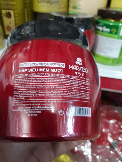 _Kem hấp_ ủ tóc siêu mượt MARADO hàng chuẩn . _Xuất xứ . Việt nam _Dung tích . 650ml _Công dụng . Hấp tóc marado tạo lớp màng bảo vệ ngăn ngừa các tác nhân gây hại từ bên ngoài đồng thời giúp kiểm soát và phục hồi tóc hư tổn vô cùng hiệu quả. cung cấp dưỡng chất và độ ẩm cần thiết cho tóc khô xơ giúp duy trì độ ẩm cho tóc mềm bóng mượt. phục hồi triệt để vùng tóc khiếm thuyết hư tổn giúp tóc khỏe mạnh tận sâu bên trong .ngăn ngừa tóc gãy rụng. _ cách dùng. sau khi gội đầu cho một lượng thích hợp ra lòng bàn tay Thoa đều lên tóc và massage từ gốc đến ngọn để có kết quả tốt nhất nên sử dụng máy Hấp tóc hoặc quấn khăn nóng từ 10 đến 15 phút rồi xả lại với nước sạch Hũ 650ml