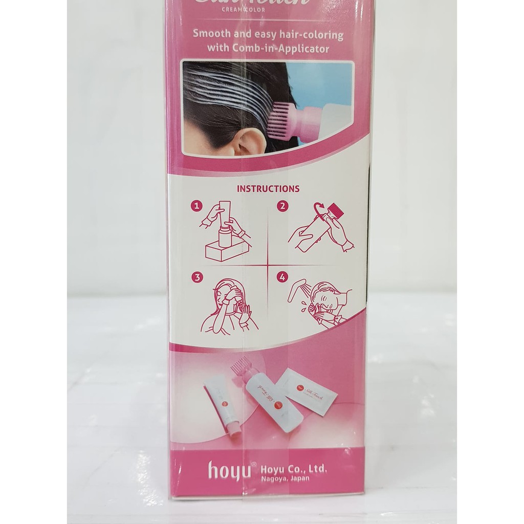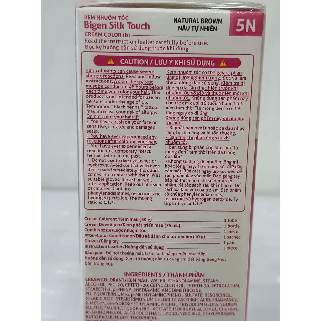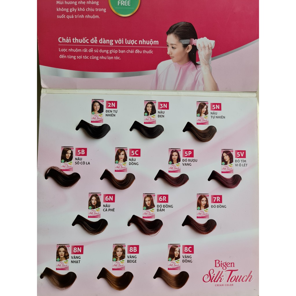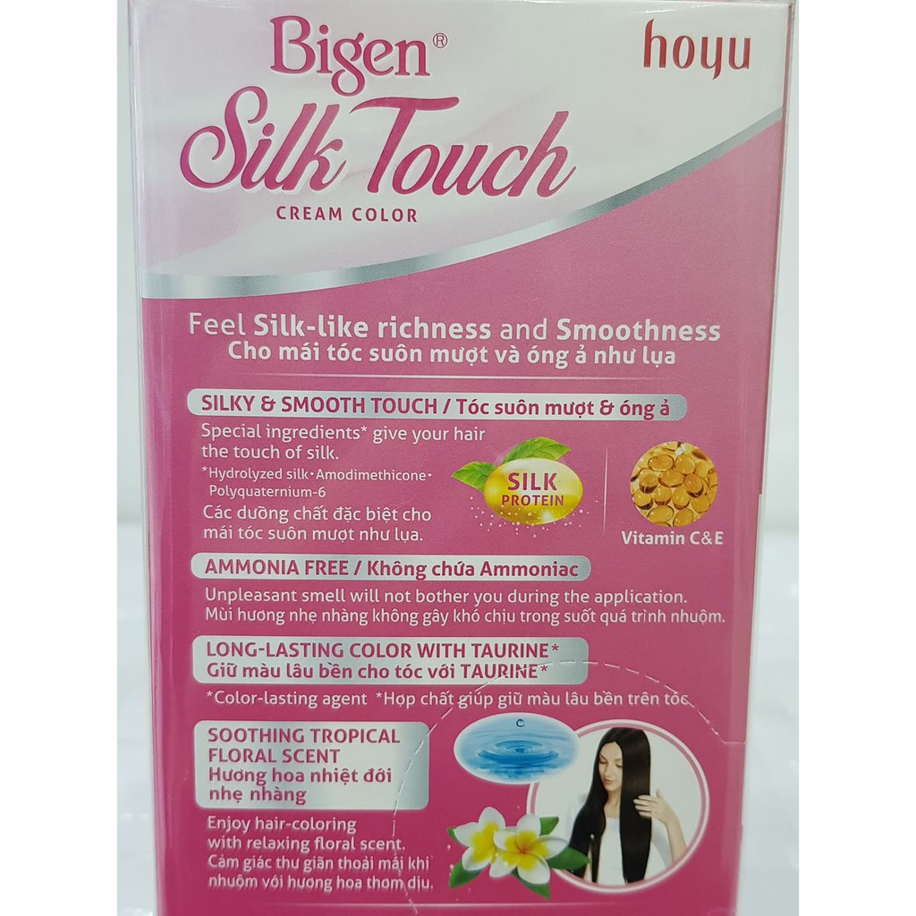 Ưu điểm: +Bảo vệ mái tóc sau nhuộm mềm mượt, bóng khỏe +Phủ bạc tối ưu toàn bộ mái tóc +Nhiều tông màu thời trang tươi trẻ +Thành phần thiên nhiên thân thiện an toàn sức khỏe +Tự nhuộm dễ dàng tại nhà với dụng cụ chuyên dụng tặng kèm theo sản phẩm +Hương hoa dễ chịu +Dùng được cho Nam & Nữ – Thuốc nhuộm Bigen Silk Touch được pha chế theo công thức đặc biệt, thuốc nhuộm tóc Bigen cho độ bao phủ màu tuyệt đối, giúp phái đẹp sở hữu mái tóc rực rỡ và óng ánh, cho suối tóc ánh màu tỏa sáng. – Thuốc Bigen Silk Touch có thành phần chứa chiết xuất từ 6 dưỡng chất thảo dược, vì thế Bigen an toàn, luôn mang lại cho tóc vẻ mềm mại, ngăn ngừa tình trạng khô xơ, gãy rụng, chăm sóc tóc hiệu quả. – Thuốc nhuộm tóc Bigen Nhật có thời gian phủ bạc hoàn hảo, chỉ trong 10 phút. Thuốc nhuộm tóc Bigen là một trong những bí quyết làm đẹp của phụ nữ. Tóc khi nhuộm bằng Bigen Silk Touch có đặc điểm: Công thức làm ẩm độc đáo cùng với chiết xuất từ 6 loại thảo dược thiên nhiên sẽ thấm sâu vào từng sợi tóc để giữ ẩm, nuôi dưỡng và bảo vệ tóc. Mái tóc được nhuộm bằng Bigen sẽ có đặc điểm sau: – Sẽ rất mềm, mượt, khỏe và không bị khô – Màu sắc tự nhiên – Màu đồng nhất, bền màu Tính năng: 4 Thành Phần Thảo Mộc Thiên Nhiên tăng cường dinh dưỡng, bổ sung độ ẩm và tạo lớp phủ bảo vệ giúp tóc bóng khỏe và bền màu: Vitamin E: Bổ sung dinh dưỡng Nhân sâm: Phục hồi tóc hư tổn Dầu Oliu: Tăng cường độ ẩm Protein: Giúp tóc suôn mượt, óng Mã màu Bigen Silk Touch như sau 2N : Đen 3N : Nâu đen 5B : Nâu socola 5C : Nâu đồng 5N : Nâu Tự Nhiên 5P : Đỏ riệu vang 5V : Đỏ tím Violet 6N : Nâu café 6R : Đỏ đồng đậm 7R : Đỏ đồng 8N : Vàng nhạt 8B : Vàng Beige 8C : Vàng Đồng Hướng dẫn sử dụng: (có giấy hướng dẫn sử dụng chi tiết trong hộp sản phẩm) – Đeo bao tay có sẵn trong hộp. – Tuốt kem trong tuýp kem nhuộm vào chai Phát Triển Màu theo tỉ lệ 1: 1.5, đậy nắp lắc nhẹ và đều tay cho đến khi cảm thấy bình căng. – Đổi nắp chai bằng đầu lược nhấn nắp bình nhựa rồi lấy bọt màu xoa đều lên tóc (từ chân tới ngọn) và bắt đầu chải từ phần lộ bạc nhiều nhất, chải đều từ gốc đến ngọn trong 10 phút và chờ thêm 25 phút để tóc ngầm kem nhuộm. Khi thấy bình vơi bọt, tiếp tục lắc nhẹ để tạo bọt tiếp. – Để từ 30 – 45 phút hoặc lâu hơn (tuỳ tóc khỏe hay yếu). Tóc khỏe để thời gian lâu hơn tóc yếu.5. Xả sạch lại với nước ấm cho đến khi nước trong. – Tiếp tục thoa đều tóc với gói dầu xả mềm mượt tặng kèm theo sản phẩm. – Bôi dầu xả lên tóc và để trong 1 phút rồi xả sạch lại tóc. Ngoài ra, để nhuộm tóc an toàn và hiệu quả, bạn nên lưu ý một số điều sau: Không nhuộm tóc khi da đầu bị trầy, mắc các bệnh về máu, khi đang hành kinh hoặc có thai. Tuyệt đối không để thuốc nhuộm dính vào lông mày và lông mi Thuốc nhuộm chỉ dùng được trong vòng 30 phút sau khi pha chế Không nhuộm tóc thường xuyên, mỗi lần nhuộm cách nhau ít nhất 6 tháng Hạn chế uốn, sấy, phơi nắng, ép sau khi nhuộm để tránh bị xơ và phai màu tóc.