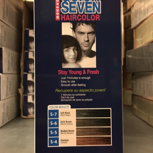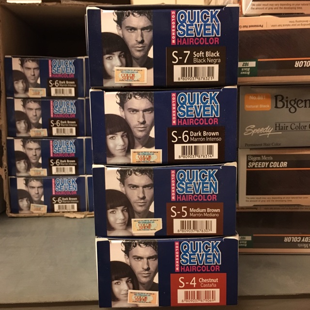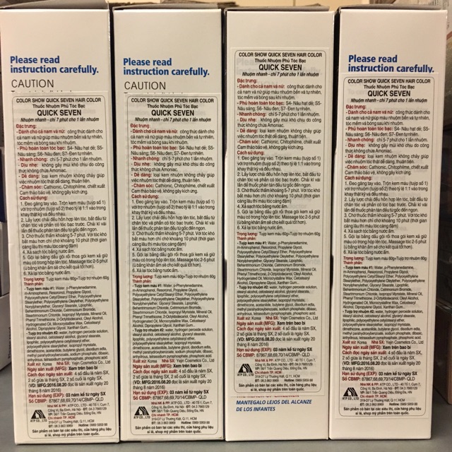 Thuốc nhuộm phủ bạc Quick Seven với công thức dành cho cả nam và nữ giúp màu nhuộm bền và tự nhiên, tóc mềm và bóng sau khi nhuộm. Bạn chỉ cần 5 - 7 phút cho 1 lần nhuộm Thuốc nhuộm dạng kem không chảy, không lem với phụ kiện đi kèm khay nhuộm đầy đủ. Hướng dẫn sử dụng và bảo quản • Đeo găng tay vào • Nặn thuốc nhuộm thứ (tuýp số 1) và dung dịch trợ nhuộm số (tuýp số 2) theo tỷ lệ 1:1 vào trong khay nhuộm thật kỹ và đều nhau • Dùng lược nhuộm 2 đầu (lược và chổi có sẵn trong hộp) thoa và chải thuốc đều lên tóc, bắt đầu từ chân tóc, phần có tóc bạc trước • Chải tóc kỹ vài lần để thuốc phân tán đều trên tóc từ gốc đến ngọn • Chờ trong vòng từ 5 -7 phút, thuốc sẽ bắt màu (với tóc khó bắt màu hơn thì có thể chờ khoảng 10 phút) • Khi tóc đã bắt màu, xả nước ấm cho đến khi nước xả thật trong • Gội đầu bằng dầu gội rồi thoa gói kem xả giữ màu lên tóc • Massage tóc 2 - 5 phút (ủ bằng khăn ấm sẽ cho kết quả tốt hơn) • Bảo quản nơi thoáng mát, tránh ánh nắng trực tiếp • Giữ xa tầm tay trẻ em