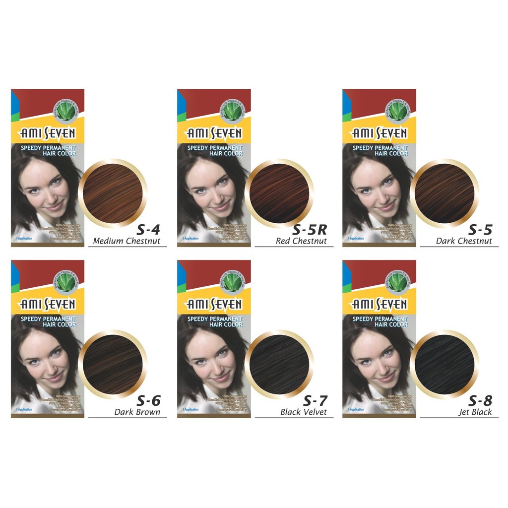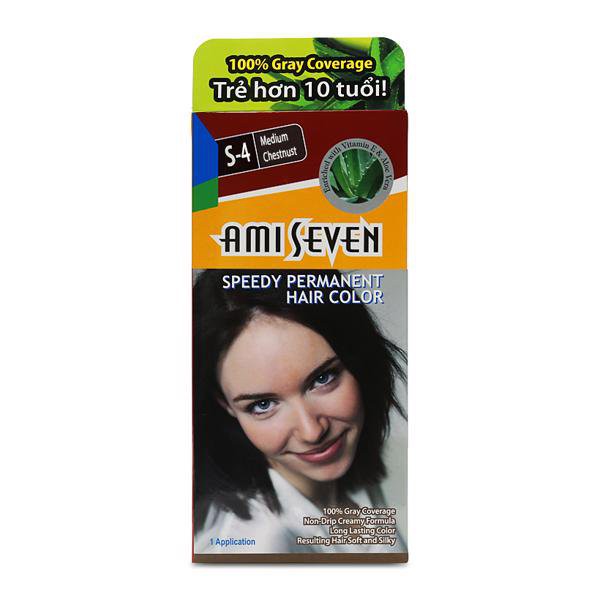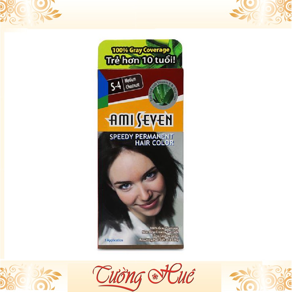 Thuốc nhuộm phủ bạc dược thảo AMI SEVEN Nhanh 7 Phút. Xuất xứ: Hàn Quốc. Khối lượng tịnh: Kem màu: 60g, Kem trợ nhuộm: 60g. Ra đời tại xứ sở Kim chi, Ami Seven là sản phẩm danh tiếng của Công ty Saehan Cosmetics Korea với trên 62 năm kinh nghiệm sản xuất mỹ phẩm tóc. Ami Seven chinh phục hàng triệu khách hàng khắp thế giới nhờ sự an toàn, hiệu quả vfa tính tiện lợi. Hơn 14 năm có mặt tại Việt Nam, Ami Seven hiện là một trong những sản phẩm nhuộm tóc bạc bán chạy nhất thị trường, là sự lựa chọn hàng đầu cho những ai mong muốn gìn giữ nét đẹp của "Một gốc con người". 7 màu phủ sáng: S3: Nâu sáng. S4: Nâu hạt dẻ. S5: Hạt dẻ đậm. S5R: Hạt dẻ ánh đỏ. S6: Nâu đậm. S7: Đen tự nhiên. S8: Đen huyền. Khám phá 7 ưu điểm của Ami Seven. Phủ 100% tóc bạc: Màu nhuộm bền và đẹp, đồng nhất và rất tự nhiên. Nhuộm nhanh: Chỉ 7 phút là thuốc đã bắt màu. Công thức độc đáo: Không chảy và dễ để rửa sạch. Dễ chịu: Không có mùi Amoniac gây khó chịu khi sử dụng. Giàu dưỡng chất dược thảo thiên nhiên: Chiết xuất từ cây Lô Hội và Vitamin E cho tóc thực sự bóng khỏe và mềm mượt. Tự nhuộm dễ dàng: Nhuộm tại nhà mà kết quả vẫn đẹp như nhuộm ở Salon. Kinh tế: Tuýp 60g tiết kiệm hơn. Nếu bạn dùng không hết, vặn chặt nắp để sử dụng cho lần kế tiếp. HDSD: Xem tờ hướng dẫn sử dụng chi tiết bằng tiếng Việt bên trong hợp sản phẩm. Lưu ý: Kiểm tra kích ứng 48h trước khi nhuộm. Không sử dụng sản phẩm này nếu bị dị ứng, mẩn đỏ, ngứa,... Mang găng tay khi nhuộm Tránh tiếp xức với mắt. Nếu bị thì rửa ngay bằng nước sạch. Không nhuộm cho lông mày, lông mi. Để nơi khô ráo, thoáng mát, tránh ánh nắng trực tiếp của mặt trời. Tránh xa tầm tay trẻ em.