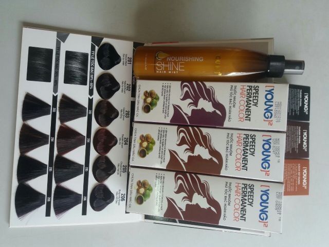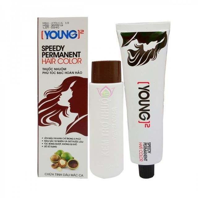THUỐC NHUỘM PHỦ TÓC BẠC HOÀN HẢO YOUNG trọng lượng : 60 g x 2 quy cách : 1 tuýp thuốc nhuộm , 1 lọ trợ oxy, 1 găng tay nilon Sản phẩm của công ty mỹ phẩm DPT Cosmetics, Việt Nam. Thuốc nhuộm tóc Young dễ sử dụng , phủ bạc hoàn hảo, lên màu nhanh chỉ trong 5 phút, màu sắc tự nhiên và giữ được lâu, tóc bóng mượt mà không bị khô, không bị kích ứng da đầu, có nhiều màu sắc để lựa chọn, giá thành hợp lý 1. THÀNH PHẦN : xem trên bao bì 2.CÔNG DỤNG : - LÊN MÀU NHANH CHÓNG CHỈ TRONG 5 P - MÀU SẮC TỰ NHIÊN VÀ GIỮ ĐƯỢC LÂU - TÓC BÓNG MƯỢT , KHÔNG BỊ KHÔ - DỄ SỬ DỤNG 3. CÁCH SỬ DỤNG : - gội sạch tóc và lau khô tóc , lưu ý không cào mạnh vào da đầu - dùng chén nhựa pha kem nhuộm ( Color cream ) và kem trợ nhuộm ( Developer ) theo tỉ lệ 1 : 1 ( số lượng vừa đủ nhuộm ) . Đóng nắp kĩ bảo quản phần còn lại để sử dụng tiếp lần sau - trộn đều hỗn hợp, mang găng tay và bôi kem đều lên tóc từ chân ra ngọn - đợi trong vòng 5-20 phút tùy theo nhu cầu đậm nhạt - khi màu lên đúng theo ý muốn, xả tóc lại thật sạch - sau khi nhuộm phủ bạc được một thời gian, phần chân tóc sẽ mọc lên 1-2 cm, nếu muốn nhuộm lại phần chân tóc này ta chỉ cần thực hiện bước thứ 2 là được 4. BẢNG MÀU : thuốc nhuộm tóc Young có 6 tông cơ bản quý khách nên để chọn phân loại màu hoặc để lại ghi chú để shop giao màu đúng nhé - tông 201 : đen tự nhiên - tông 202: nâu tự nhiên - tông 203 : màu nâu đồng - tông 204 : màu nâu đỏ. - tông 205 : màu nâu hạt dẻ. - tông 206 : màu nâu hồ đào ( đang hết hàng