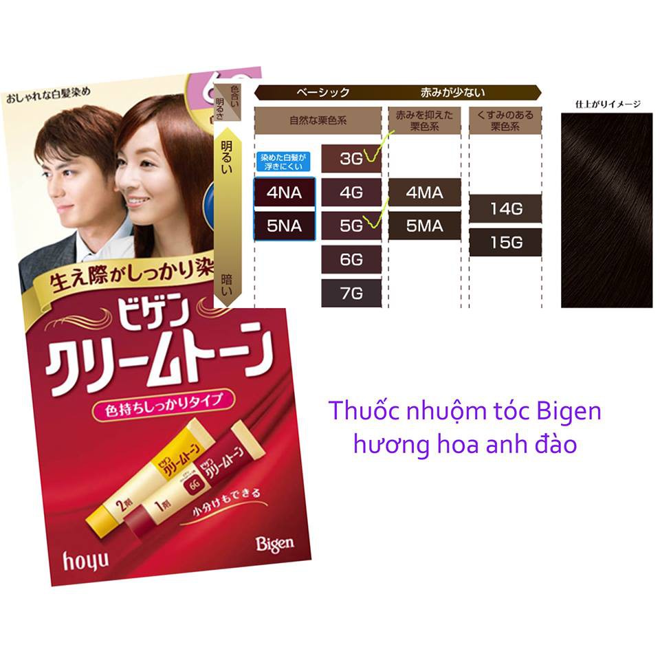 7G: mau den 6G: Màu đen tự nhiên (đen ngả nâu) 6G: giành cho cả nam và nữ 5G: Đen ngả nâu (sáng hơn 6G) 4G: Màu nâu 3G: Nâu sáng Bigen Nhật Điểm nổi bật sản phẩm: 1 Hoàn toàn từ thảo dược an toàn khi sử dụng 2 Sử dụng dễ dàng tại nhà tiết kiệm chi phí 3 Lên màu chuẩn , lâu phai, mùi dễ chịu. Không bị khô như thuốc nhuộm ở tiệm 4 Màu sắc đa dạng tha hồ lựa chọn Cách sử dụng: Mở vỏ hộp cho các hỗn hợp vào nhau rồi lắc đều trong 10 phút. Sau đó đổ hỗn hợp vào khay gội đều trên tóc khô. Để sau 30 phút xả lại bằng nước xả bạn sẽ có 1 mái tóc như ý. thuốc nhuộm tóc nhật Bảo quản: Để sản phẩm nơi khô ráo tránh độ ẩm cao. Tránh ánh nắng trực tiếp mặt trời SẢN PHẨM THUỐC NHUỘM TÓC NHẬT BIGEN ĐƯỢC MUA TRỰC TIẾP TẠI CÁC SIÊU THỊ LỚN CỦA NHẬT (CÓ BILL) VÀ ĐƯỢC CHUYỂN VỀ VN TRONG NGÀY, BẢO ĐẢM 100% CHẤT LƯỢNG.