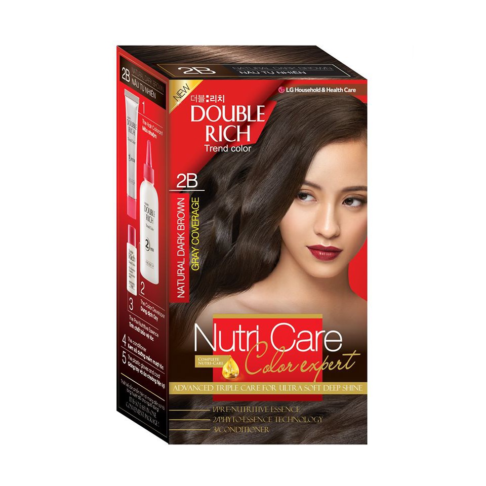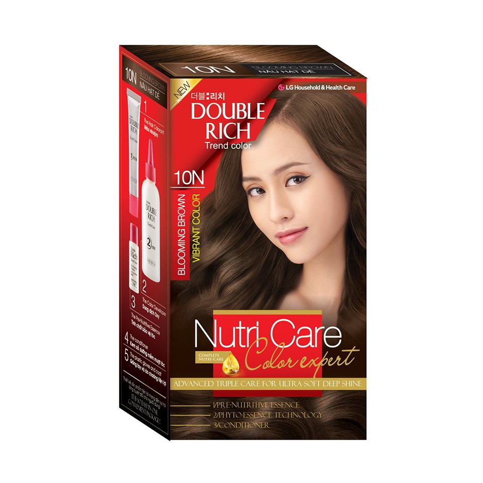 Với công thức cải tiến từ Viện Nghiên cứu thuộc tập đoàn LG Household & Health Care - Hàn Quốc. - Sử dụng các màu sắc tự nhiên và dưỡng chất chăm sóc tóc giúp tóc mềm mượt & bền màu sau khi nhuộm. - Có 2 cách lựa chọn: • Sắc màu thời trang: + 6B - Nâu ánh đồng tự nhiên + 6NY - Nâu ánh kim thanh lịch + 10N - Nâu hạt dẻ dịu dàng + 12N - Nâu ánh vàng rực rỡ. • Sắc màu tự nhiên (dùng phủ tóc bạc ): + 1NB - Đen tự nhiên + 2B - Nâu tự nhiên - 3 Bước hoàn thiện vẻ đẹp của mái tóc: 1. Pre-Nutritive Essence: Sử dụng trước khi nhuộm, giúp bảo vệ tóc & đều màu nhuộm, hạn chế hư tổn. 2.Trend Color: Tăng cường độ lên màu cho tóc. 3. After Intensive Treatment: Xả dưỡng tóc sau khi nhuộm, tái tạo cấu trúc sợi tóc bị hư tổn, cho tóc luôn mềm mượt và bền màu. ✔ Hướng dẫn sử dụng - Bước 1: Thoa đều Pre-nutritive Essence lên toàn bộ mái tóc, tập trung các vùng tóc bị xơ yếu • Massage nhẹ nhàng trong 5’ cho Essence thấm đều - Bước 2: Mang bao tay, nặn tuýp số 1 vào chai số 2 • Vặn nắp chặt & lắc kỹ để hỗn hợp được trộn đều - Bước 3: Nhuộm từ sau gáy – 2 bên tai – 2 bên thái dương – Trước trán – Giữa trán • Dùng tay massage để thuốc thấm đều trong 30’ • Xả sạch lại với nước • Thoa đều After Nutritive Treatment lên tóc, massage trong 3-5’. Xả sạch lại với nước, • Không gội đầu lại trong vòng 02 ngày, sau khi nhuộm Bảo quản và hạn sử dụng - Tránh nhiệt độ cao & ánh nắng trực tiếp chiếu vào. - Tránh xa tầm tay trẻ em. - Hạn sử dụng: 01 năm kể từ ngày sản xuất.