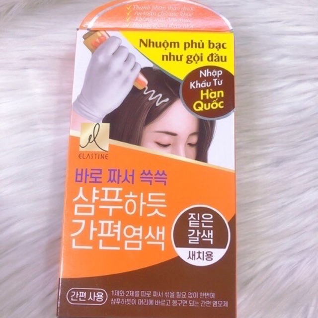Gội là đen- gội là nâu Elastine thảo dược Hàn Quốc Elastin Nhuộm Phủ Bạc - Đen Tự Nhiên Nhuộm phủ bạc đơn giản như gội đầu 1. EASY! Tiện dụng: Với thiết kế dạng gói, chỉ cần chiết sản phẩm ra tay, thoa đều lên tóc như gội đầu rồi xả sạch là xong. 2. QUICK! Nhanh chóng: Phủ bạc vừa nhanh vừa đơn giản chỉ trong 15 phút! 3. SAFE! An toàn: Yên tâm sử dụng, không lo kích ứng da đầu và mắt. - Chứa thảo dược đậu đen, tỏi đen, rau diếp cá cho mái tóc đen khỏe đầy sức sống. - Không chứa Amoniac, chất nhuộm an toàn không gây hại cho sức khỏe