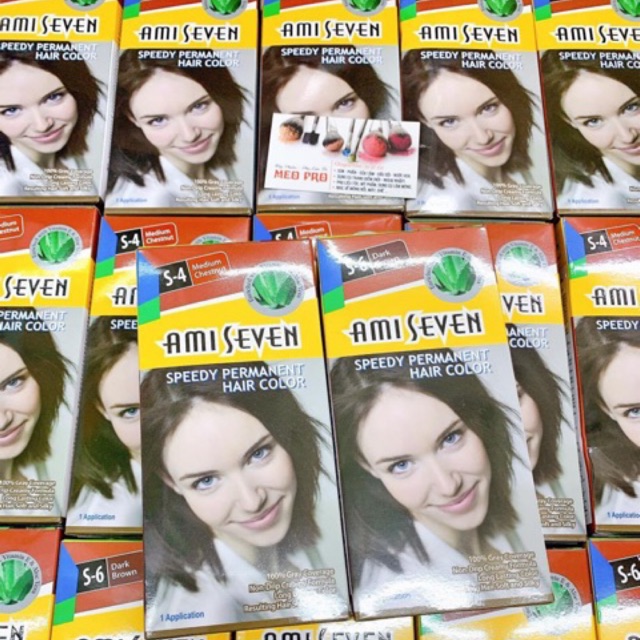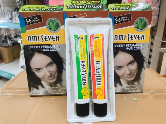 KHÁM PHÁ 7 ƯU ĐIỂM CỦA AMI SEVEN: • Phủ 100% tóc bạc: mầu nhuộm bền và đẹp, đồng nhất và rất tự nhiên. • Nhuộm nhanh: chỉ 7 phút là thuốc đã bắt mầu. • Công thức độc đáo: không chảy và dễ rửa sạch. • Dễ chịu: không có mùi amoniac khó chịu. • Giầu dưỡng chất dược thảo thiên nhiên: chiết xuất từ cây Lô Hội (Aloe Vera) và Vitamin E cho tóc thực sự bóng khỏe và mềm mượt. • Tự nhuộm dễ dàng: nhuộm tại nhà mà kết quả vẫn đẹp như nhuộm ở tiệm. • Kinh tế: túyp 60g tiết kiệm hơn (loại khác chỉ 40g). Nếu bạn dùng không hết, vặn chặt nắp để sử dụng cho lần kế tiếp. 7 MÀU NHUỘM PHỦ BẠC: S3: Nâu sáng, S4: Nâu hạt dẻ, S5: Hạt dẻ đậm, S5R: Hạt dẻ ánh đỏ, S6: Nâu đậm, S7: Đen tự nhiên, S8: Đen huyền. ❤️❤️❤️ chuyên : 👉🏻 mỹ phẩm makeup chuyên nghiệp 👉🏻 phụ kiện ngành nail 👉🏻 phụ liệu tóc 👉🏻phụ kiện tóc cô dâu 👉🏻phụ kiện máy móc 👍 luôn cập nhật các mẫu mã mới đến với khách hàng ❤️tất cả đều có tại shop mỹ phẩm - phụ liệu nail- tóc thanh tâm 245 đường 23 tháng 10 nha trang 💗💗💗đến với shop , là đến với cả thế giới làm đẹp. Đt: 02583810367